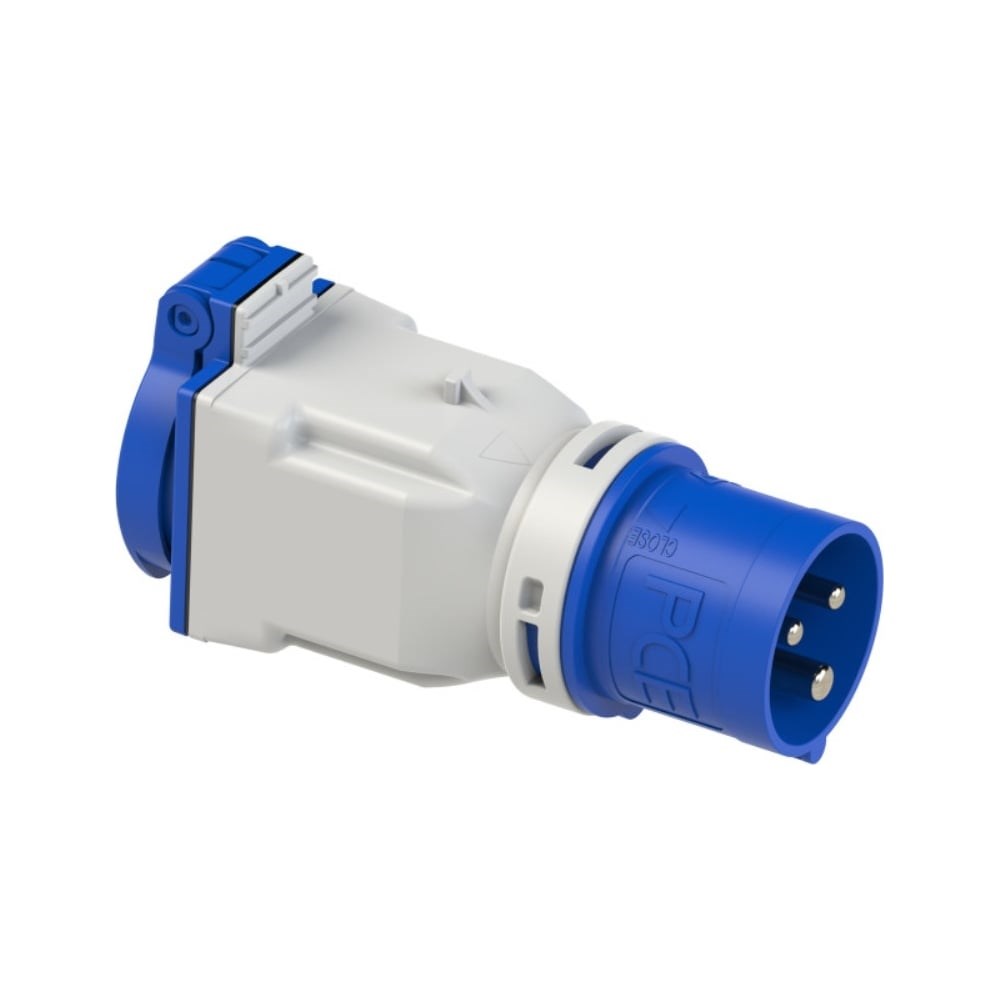 Адаптер-переходник предназначен для подключения евро вилки к промышленной розетке. Вход – промышленная вилка 2Р + Е, выход – розетка 220 с заземлением. Номинальный ток: 16 А. Номинальное напряжение: 230 В; 50 Гц. Материал контактов: латунь. Материал корпуса: ударопрочный поликарбонат. Степень защиты: IP 44. Производитель: Австрия.