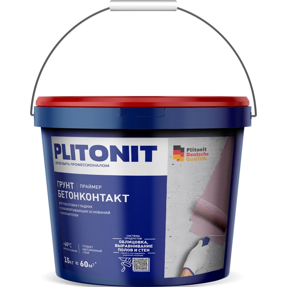Грунт PLITONIT БетонКонтакт 15 кг 16182 полностью готов к применению. Средство предназначено для предварительной обработки оснований перед проведением штукатурных, облицовочных работ, а также работ по устройству полов. Продукт отличается высокой кроющей способностью. Для внутренних и наружных работ Легкое нанесение кистью или валиком Препятствует водооттоку из смеси Расход материала - 250 г/м²
