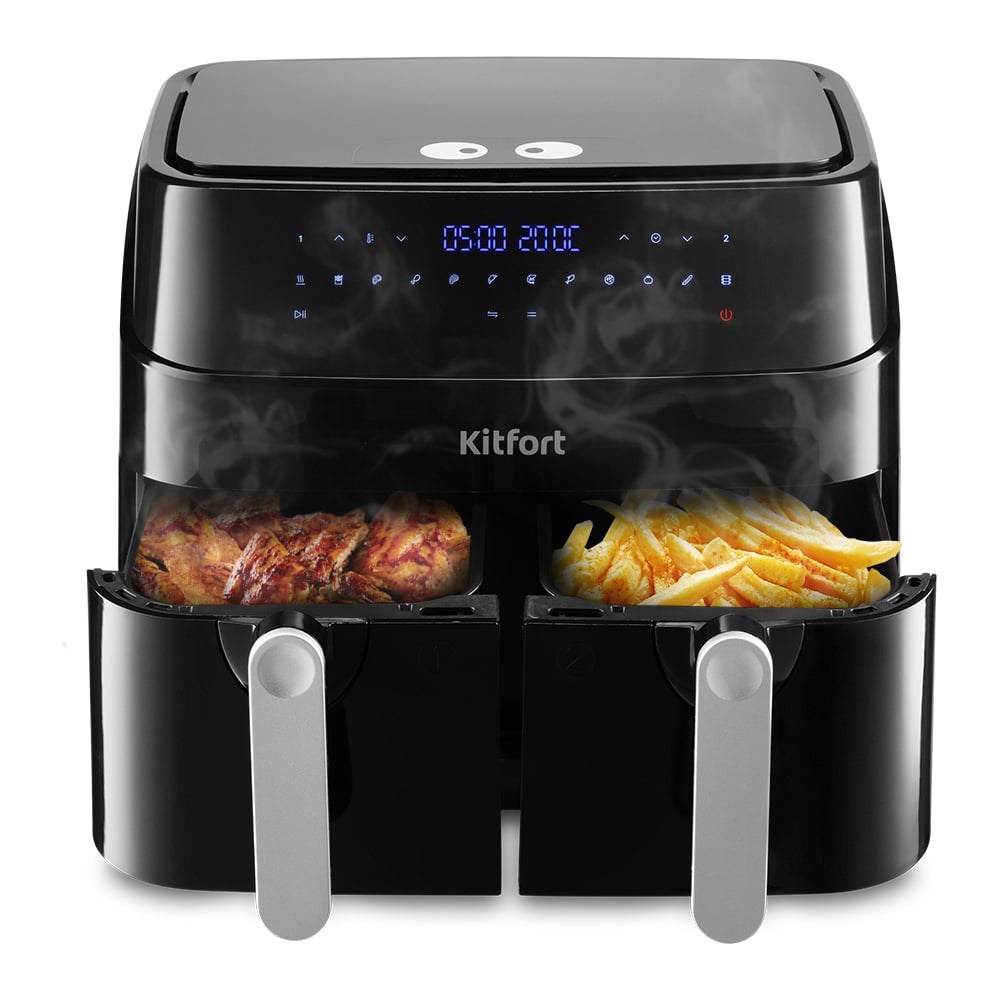 Современный аэрогриль KitfortКТ-2250 позволяет готовить большинство продуктов без добавления масла сочными и с хрустящей корочкой. Главное преимущество данного аэрогриля заключается в том, что у него имеется два нагревателя (левый и правый) и два поддона. Благодаря двум поддонам вы можете готовить 2 разных блюда одновременно, установив при этом для каждого свои настройки температуры и таймера. Благодаря функции синхронизации времени окончания приготовления вы можете приготовить основное блюдо и гарнир к одному времени и подать к столу горячими. Аэрогриль оснащен сенсорным управлением, у него 12 автоматических программ приготовления, включая подогрев, а также синхронизация приготовления. Программы позволяют использовать готовые шаблоны настроек, разработанные специально под конкретные блюда, поэтому вам не придется контролировать процесс приготовления самостоятельно — аэрогриль сам выберет необходимые параметры своей работы. На дисплее отображаются температура, время приготовления и какие нагреватели работают: левый, правый или оба. Продукты готовятся на специальных решетках, установленных в поддоны. И решетки и поддоны с антипригарным покрытием. По окончании приготовления аэрогриль автоматически отключается. Поддоны и решетки легко вынимаются и моются.