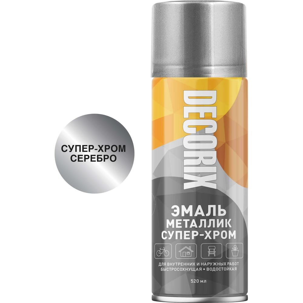 Аэрозольная эмаль Decorix СУПЕР-ХРОМ (металлик; глянцевая; серебро; 520 мл) 0158-02 DX используется в декоративно-оформительских работах, строительстве и ремонтном окрашивании. Предназначена для окрашивания: древесины, пластика, металла, бетона, кирпича, керамики, стекла, картона, минеральных поверхностей. Благодаря большой концентрации качественных пигментов эмаль образует покрытие с высокой отражающей способностью, сравнимое с зеркальной поверхностью. Уникальное покрытие придаст предметам яркий и насыщенный блеск хромированного металла и благородно выделит окрашиваемую поверхность. Аэрозольная эмаль удобна для равномерного окрашивания небольших поверхностей и труднодоступных мест. Образует гладкое, устойчивое к выцветанию покрытие.