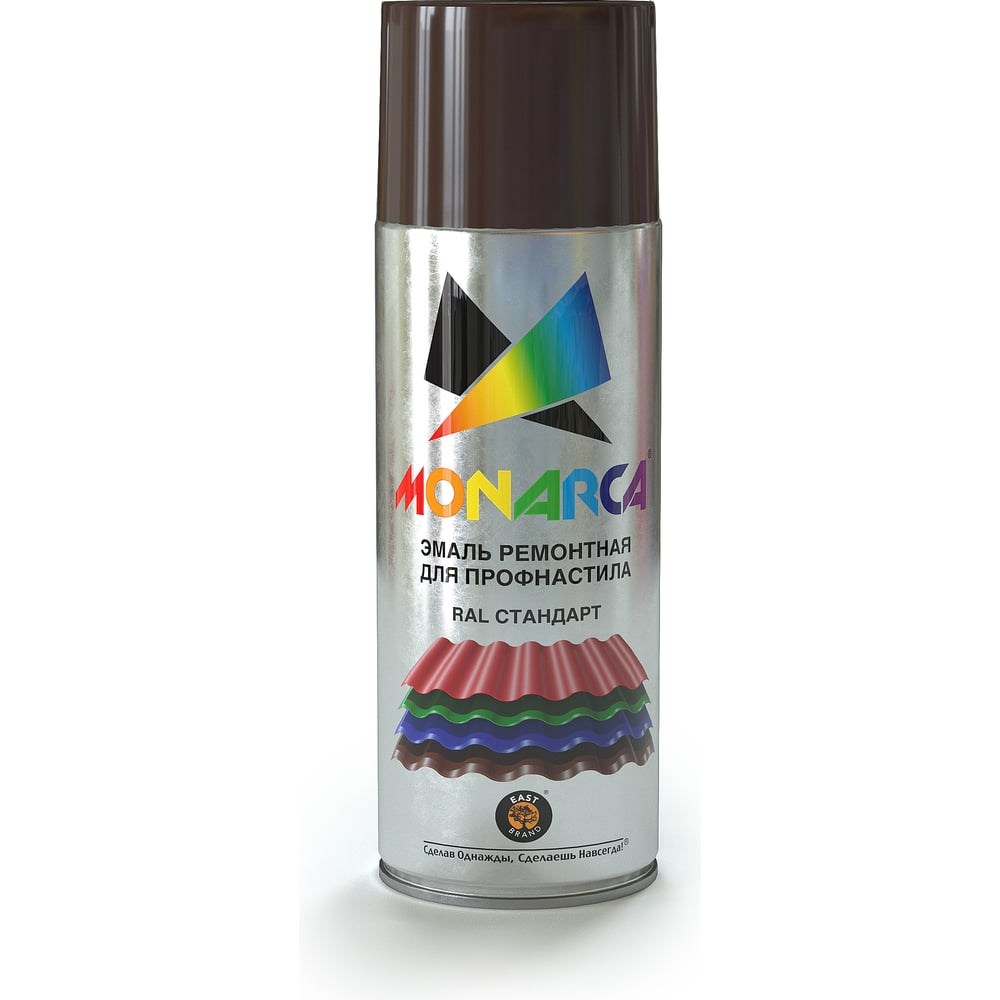 Аэрозольная эмаль для профнастила MONARCA RAL8017 шоколадно-коричневый 78017 предназначена для декоративного окрашивания элементов крепежа и головок саморезов, применяемых при монтаже заборов, кровли, водосточных систем или металлического штакетника. Продукт подходит для ремонта профнастила, устранения потертостей и царапин. Благодаря аэрозольной форме выпуска краску удобно наносить в труднодоступных местах. Финишное покрытие отличается хорошей устойчивостью к атмосферным воздействиям.