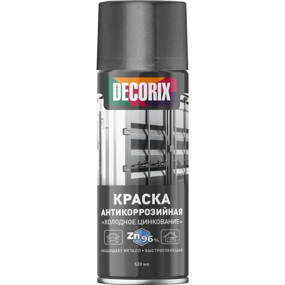 Аэрозольная краска Decorix (антикоррозийная; для защиты металла; цинк 96%; холодное цинкование; матовая; 520 мл) 0114-03 DX эффективно защищает чёрные металлы от коррозии, обеспечивая одновременно активную и пассивную (барьерную) защиту, характерную для горячего цинкования. Покрытие обладает высокой адгезией к металлическим поверхностям и устойчиво к сколам и ударам. Применяется для окрашивания и антикоррозийной обработки металлических изделий и конструкций, эксплуатируемых в атмосферных условиях всех макроклиматических районов: крыш, водосточных труб, резервуаров, наружных отливов, оград, кованных изделий, сварных швов конструкций, консервации поверхностей и т. п., в том числе ремонтного окрашивания повреждённых оцинкованных поверхностей. Аэрозольная краска удобна для точечного нанесения и окрашивания труднодоступных мест. Образовавшееся покрытие не подлежит последующему окрашиванию другими лакокрасочными материалами.