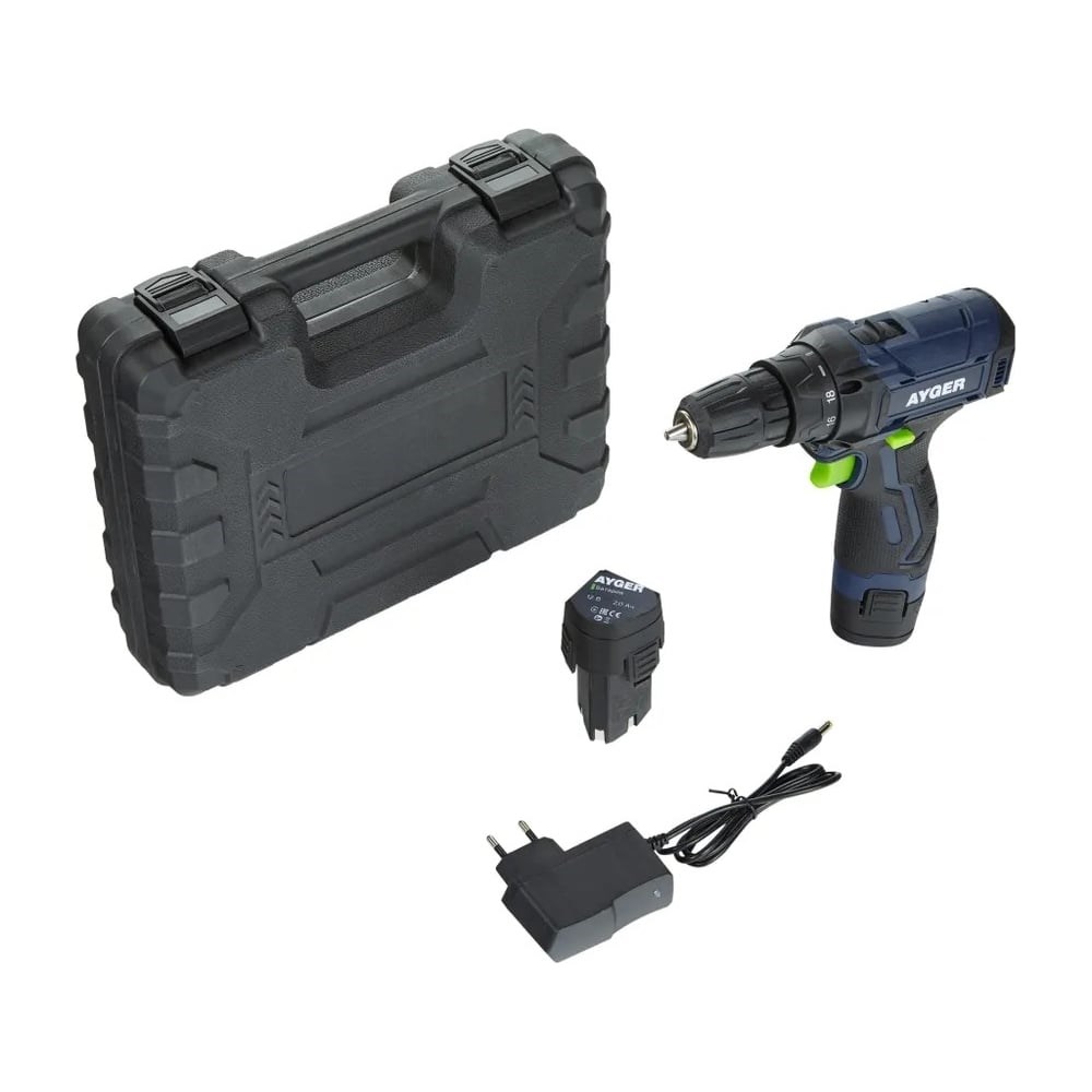 Дрель-шуруповерт AYGER AP12CN имеет удобную прорезиненную рукоятку. Пистолетный тип крепления аккумуляторов обеспечивает простоту их замены. Диаметр патрона варьируется от 0 до 10 мм, что позволяет использовать разнообразную оснастку. Реверсный ход предназначен для выкручивания крепежей. При работе в труднодоступных местах и при слабом освещении используется функция подсветки. Прочный пластиковый кейс обеспечивает удобство и безопасность хранения и транспортировки.