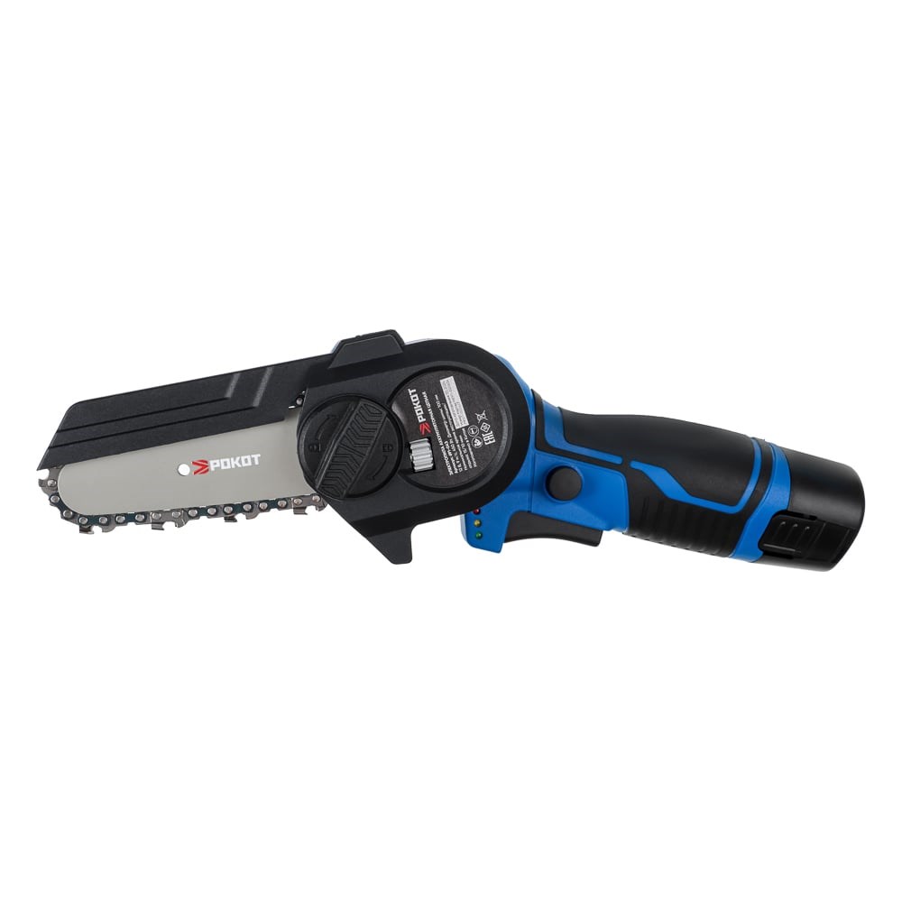 Цепная аккумуляторная электропила РОКОТ, 12 В, 5 м/с с литий-ионным аккумулятором емкостью 2.0 А*ч пригодится в строительстве, ремонте, а также на дачном участке. Имеет оптимальный уровень мощности 450 Вт. Длина шины – 100 мм. Не требует подключения к электросети, быстро заряжается. Защитный кожух делает процесс использования максимально безопасным, а эргономичная рукоятка в сочетании с низким весом и компактными габаритами не вызывает усталости даже при длительной работе. Инструмент надежный, характеризуется низким уровнем шума, не производит вредных выбросов.