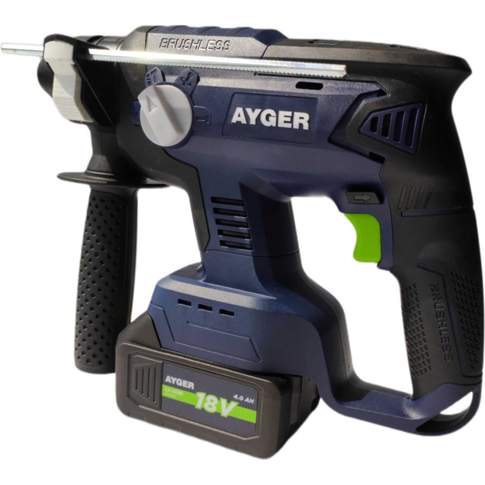 AYGER AHA18BL4 Перфоратор аккумуляторный бесщеточный - данное устройство предназначено для выполнения широкого спектра задач по сверлению и долблению. Оно эффективно работает с различными материалами, включая дерево, сталь, бетон и кирпич, поддерживая режимы сверления, сверления с ударом и ударного долбления (при использовании соответствующего рабочего инструмента). Ключевой особенностью является бесщеточный двигатель, обеспечивающий превосходную производительность и повышенную износостойкость. Для улучшения эргономики и безопасности оператора предусмотрена дополнительная рукоятка. Встроенная подсветка рабочей зоны повышает удобство эксплуатации в условиях ограниченной видимости.