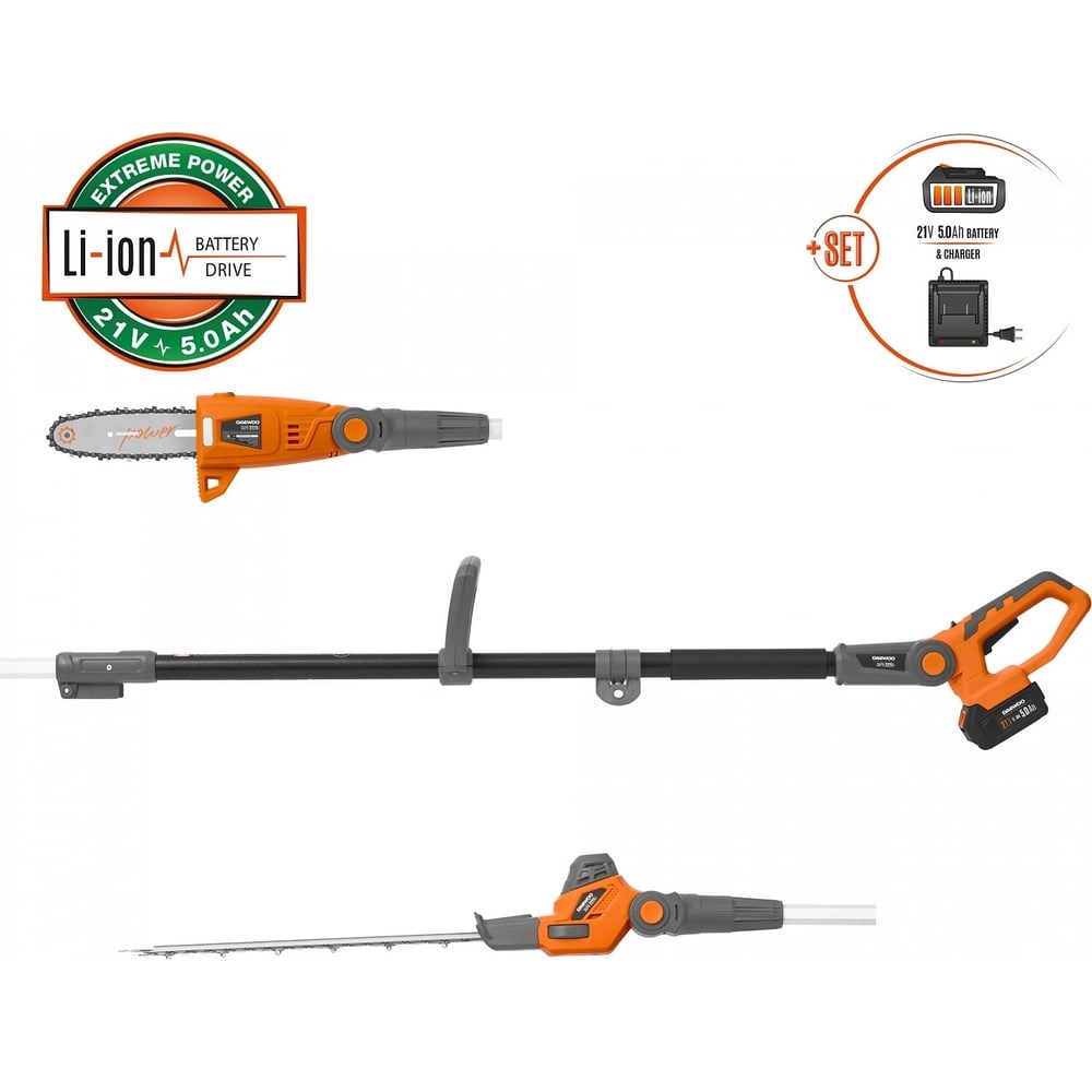 Товар совместим со всеми аккумуляторными батареями и зарядными устройствами DAEWOO линейки 21В В покупке и использованию доступны: - Аккумуляторные батареи: DABT 4221Li, DABT 5021Li, DABT 6021Li, DABT 8221Li - Зарядные устройства: DACH 2521Li, DACH 5021Li, DACH 4021Li, DACH 8021LiТелескопическая рукояткаНастройка углов работыДвустороннее лезвие кусторезаНадежная пильная цепь и шинаПолный комплект для начала работыВ комплектацию данного товара включена Батарея аккумуляторная DABT 5021Li (21В, 5,0 Ач) и зарядное устройство.