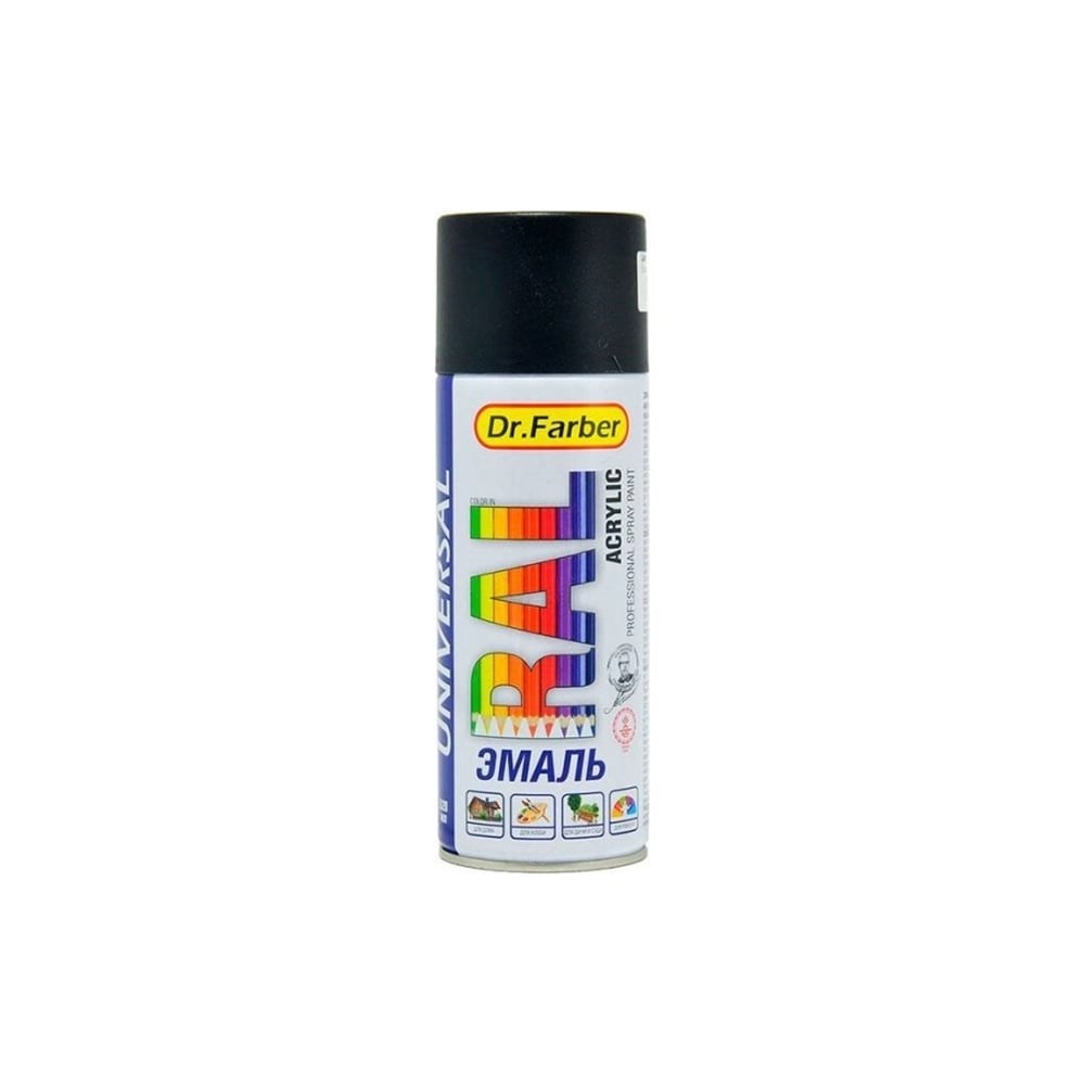 MAV Краска RAL 9005 черный янтарь Dr. Farber акриловая глянцевая применяется для быстрого и равномерного окрашивания объектов и бытовых изделий, элементов ландшафтного, интерьерного дизайна, не подвергающихся механическим нагрузкам.Рекомендуется нанесение по: бетонным, кирпичным, оштукатуренным, гипсокартонным, из искусственного и натурального камня, неглазурированной керамики, щебня; по металлическим поверхностям, в т. ч. окрашенным ранее порошковыми красками (наружные стенки холодильников, стиральных машин, микроволновых печей и т.п.), по натуральным плотным тканям (плакаты, элементы одежды), эксплуатирующимся в атмосферных условиях и внутри помещений.Окраску проводить на открытом воздухе, в производственных помещениях при наличии вентиляции.Подготовка поверхности: окрашиваемую поверхность тщательно очистить от жировых и других загрязнений, ржавчины, окалины, старой отслоившейся краски, зашкурить, обезжирить растворителем и высушить.Нанесение: перед окраской баллон встряхивать в течение 3 минут после появления стука шарика. Распылять в вертикальном положении тонкими слоями с расстояния 25 - 30 см при температуре от 5 ºС до 30 ºС.Распыление проводить сначала по горизонтали, затем, по вертикали, количество слоев может варьироваться от 1 до 3. После каждого применения следует очистить клапан: перевернуть баллон распылителем вниз и нажать на клапан в течение 2 - 5 сек. ВРЕМЯ ВЫСЫХАНИЯ: при температуре (20 ± 2) °C – 1 ч. Допускается нанесение второго слоя через 5 - 7 мин.