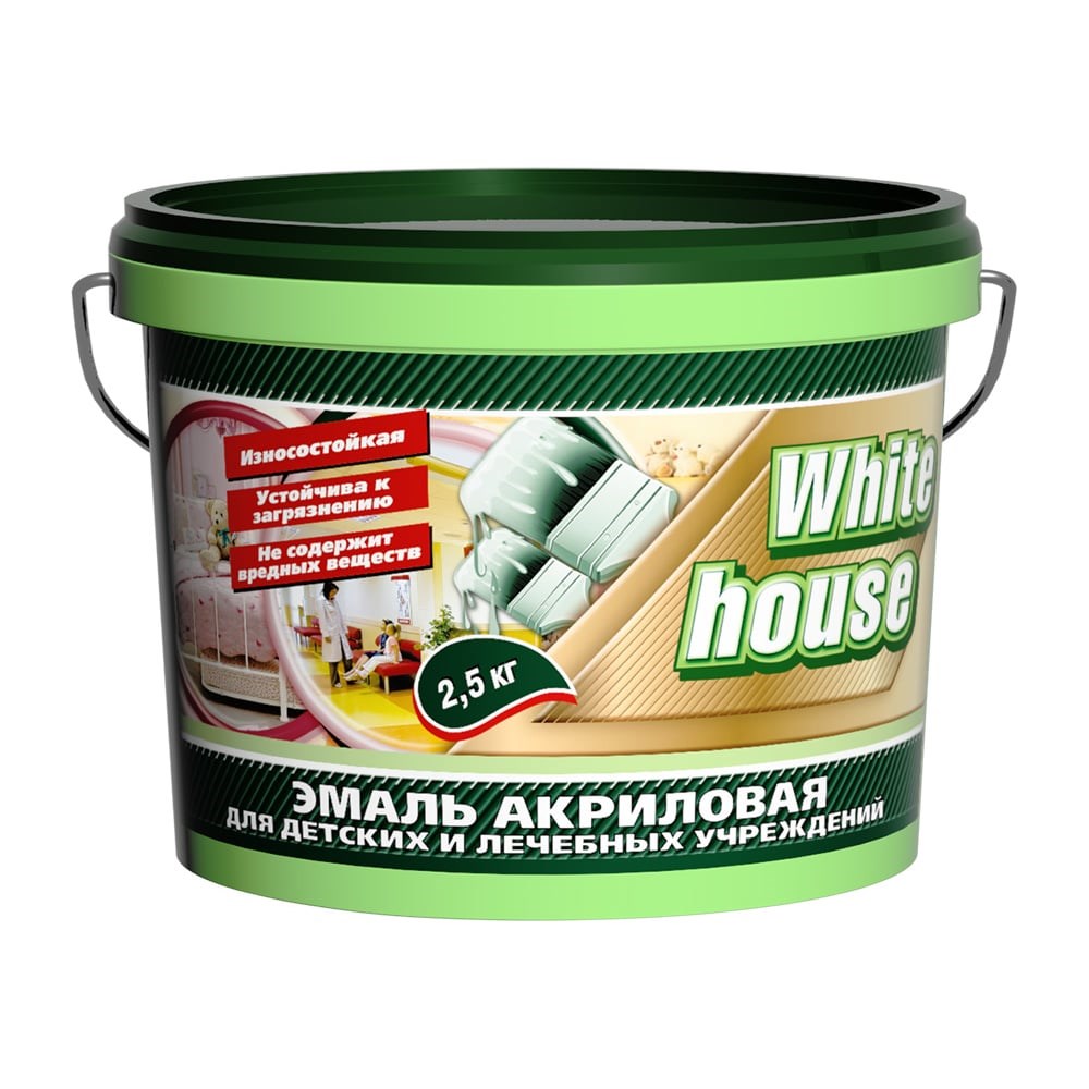 Акриловая эмаль для детских и лечебных учреждений White House (белая; полуглянцевая; 2.5 кг) 13831 предназначена для работ по минеральным, деревянным, загрунтованным металлическим и многим другим поверхностям, а также для окраски обоев. Обладает высокой прочностью, водо- и атмосферостойкостью, может применяться как интерьерная или фасадная краска. Выдерживает влажную уборку с использованием бытовых моющих средств, не желтеет в процессе эксплуатации.