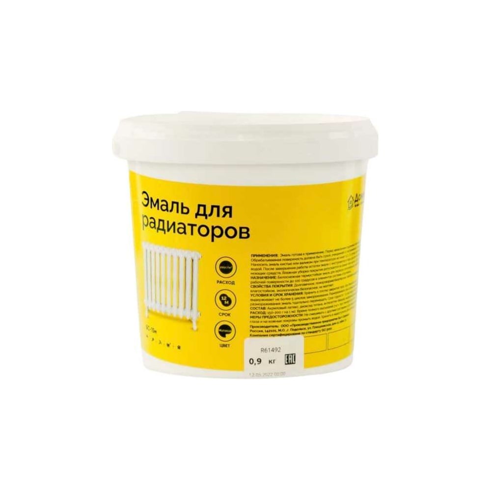 Эмаль акриловая для радиаторов Доминар БС 15 м матовая 0.9 кг R61492 - белоснежная термостойкая эмаль для окраски отопительных радиаторов с температурой рабочей поверхности до 100 градусов и элементов системы отопления. Эмаль готова к применению. Перед нанесением тщательно перемешать. Обрабатываемая поверхность должна быть сухой, очищенной от загрязнений и старых покрытий. Наносить эмаль кистью или валиком при температуре не ниже +5°С. В случае загустевания разбавить водой. После завершения работы остатки эмали с инструмента удалите водой с добавлением моющих средств. Влажная уборка покрытия допускается не ранее чем через 14 дней. Эмаль акриловая для радиаторов БС 15м матовая 0.9 кг – это инновационное и высококачественное покрытие, специально разработанное для использования на радиаторах. Ее уникальные свойства делают ее идеальным выбором для покрытия поверхностей, которые подвержены высоким температурам и другим агрессивным условиям. Эта акриловая эмаль обладает матовым финишем, который придает радиаторам элегантный и современный вид. Она представляет собой водно-дисперсионную краску, основанную на акриловых смолах, что делает ее безвредной для здоровья и безопасной в использовании.