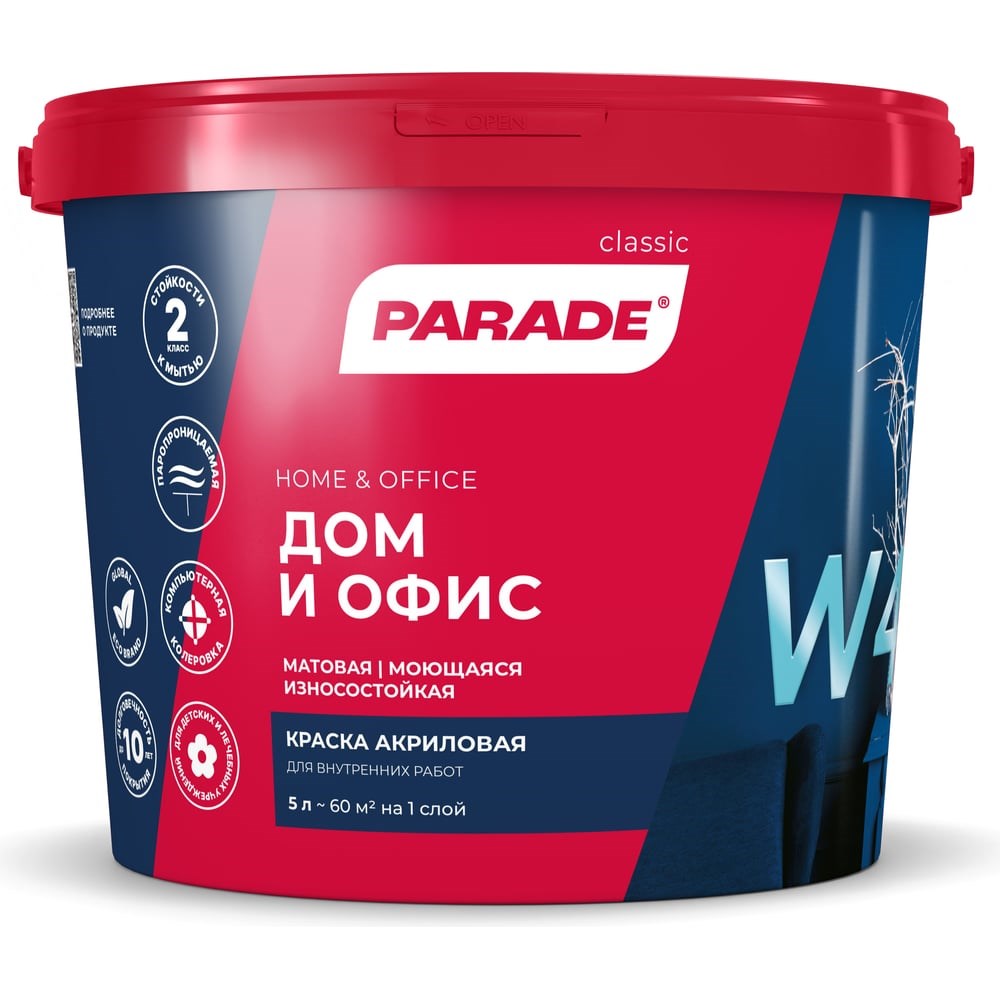 Краска акриловая PARADE W4 Дом & Офис база А 5 л Россия 90002002334 - акриловая водно-дисперсионная белая матовая краска. Образует прочное паропроницаемое покрытие, выдерживающее влажную уборку (на минеральных поверхностях). Обладает высокими декоративными свойствами, отличной укрывистостью и прочным сцеплением с основанием.Матовое особопрочное покрытиеСтойкость к сильным эксплуатационным нагрузкам и    мытью (3 класс по DIN EN 13300)Высокая укрывистость и паропроницаемостьСертифицирована для применения в детских и лечебных   учрежденияхКолеровка компьютерная PARADE или водными колерамиДолговечность интерьерного покрытия – более 5 лет