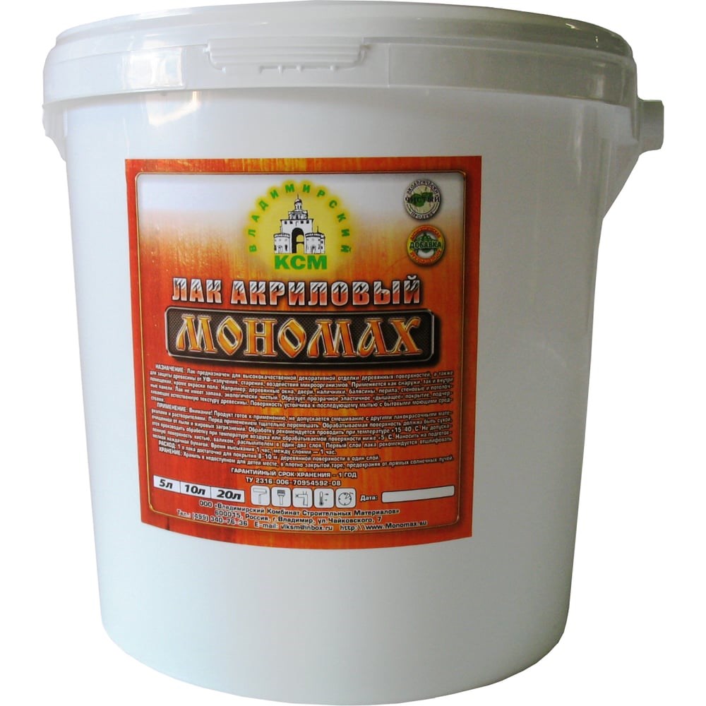 Лак акриловый St 10 л МОНОМАХ 2лак10б используется для выполнения декоративной отделки, так как он прорисовывает природный рисунок дерева и даёт прозрачное и очень прочное покрытие. Одно из главных преимуществ - быстрое высыхание. Лак может быть разбавлен обыкновенной водой, но после высыхания и отвердевания, плёнку лака можно смыть только специальным растворителем. Лакокрасочные материалы на основе акрила пригодны как для наружных работ, так и для внутренних.