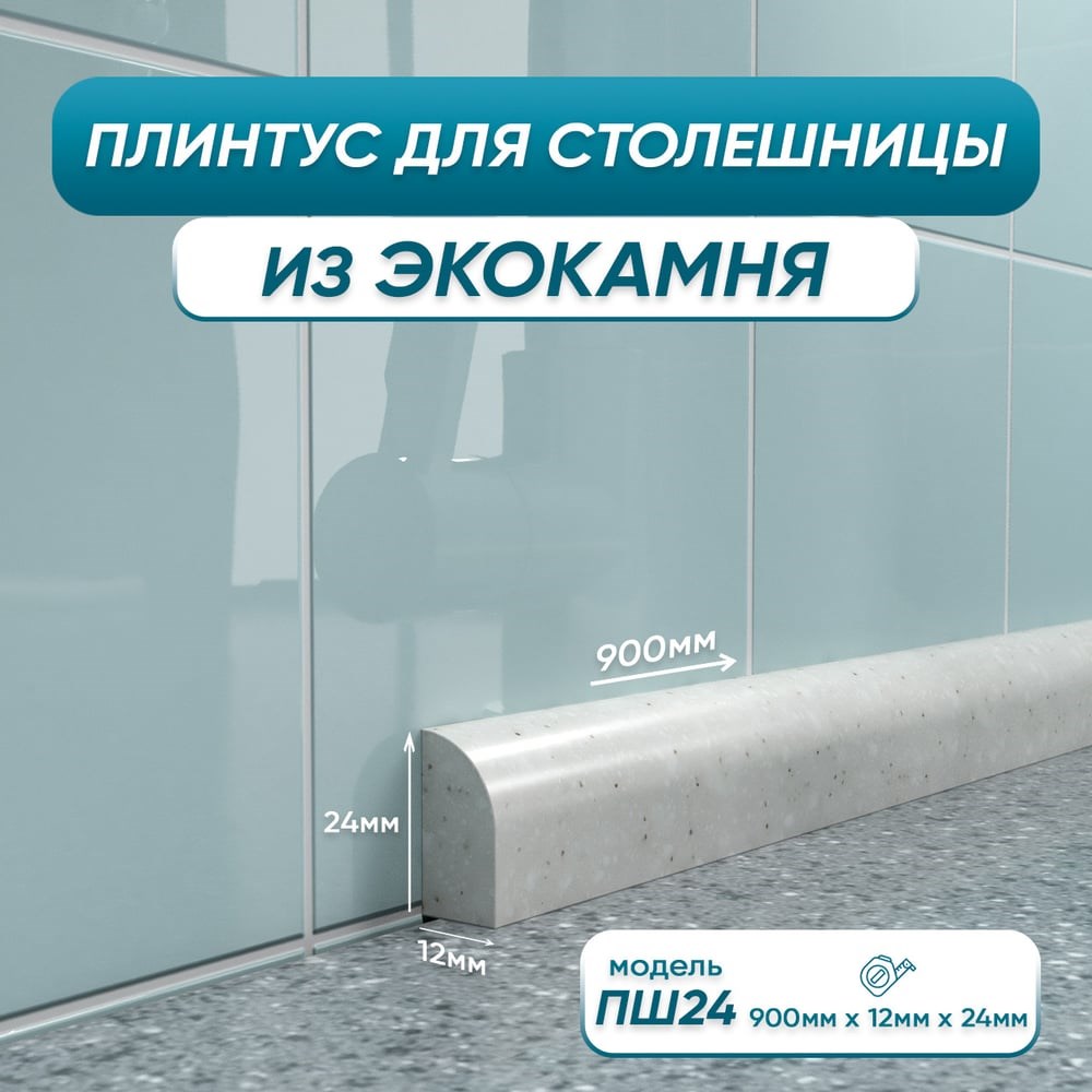 Акриловый плинтус предназначен для скрытия зазора между фартуком и столешницей. Подходит для всех типов столешниц. Искусственный камень – это твердый, цельный материал. Прост в монтаже и уходе, не меняет свой цвет и форму. Ширины бордюра 24 мм хватит, для того чтобы перекрыть зазор до 20 мм. Благодаря своим оптимальным размерам, он не только защищает от попадания воды в щели и предотвращает распространение плесени, но и хорошо скрывает все мелкие недостатки. Для распила потребуется ножовка по металлу или торцовочная пила с диском по дереву или алюминию, монтаж производится на герметик или водостойкий клей.