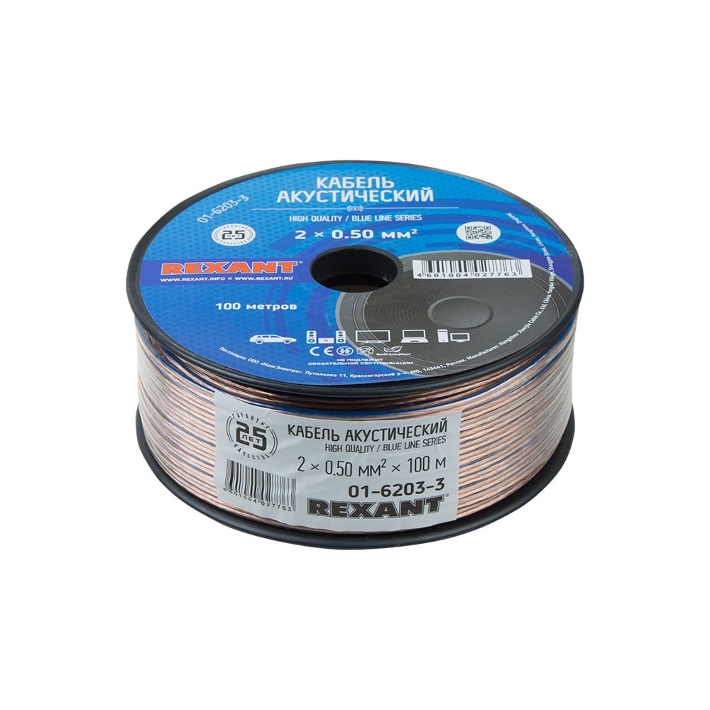 Акустический кабель REXANT серии BLUELINE предназначен для подключения полупрофессионального акустического оборудования. Отличается долгим сроком службы и качеством изготавливаемых материалов. Состоит из двух многожильных проводников, плакированных медью не менее 50% и расположенных параллельно друг другу. Проводники защищены изоляцией из прозрачного ПВХ, на которую нанесена синяя полоса.Основание кабелей – разделительное, благодаря чему при разделении проводников не требуется снимать изоляцию и оголять жилы. Площадь сечения жил – 0,50 мм².