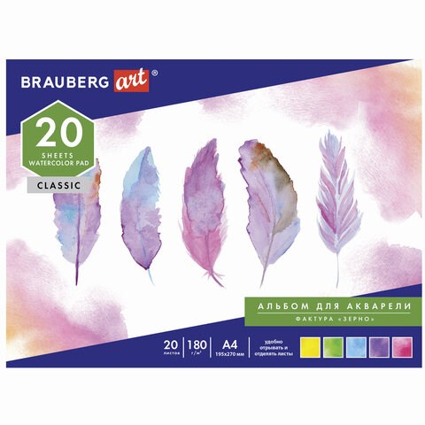 Альбом для акварели А4 (195х270 мм), ЗЕРНО, белая, 20 л., 180 г/м2, склейка, BRAUBERG ART CLASSIC, 128965