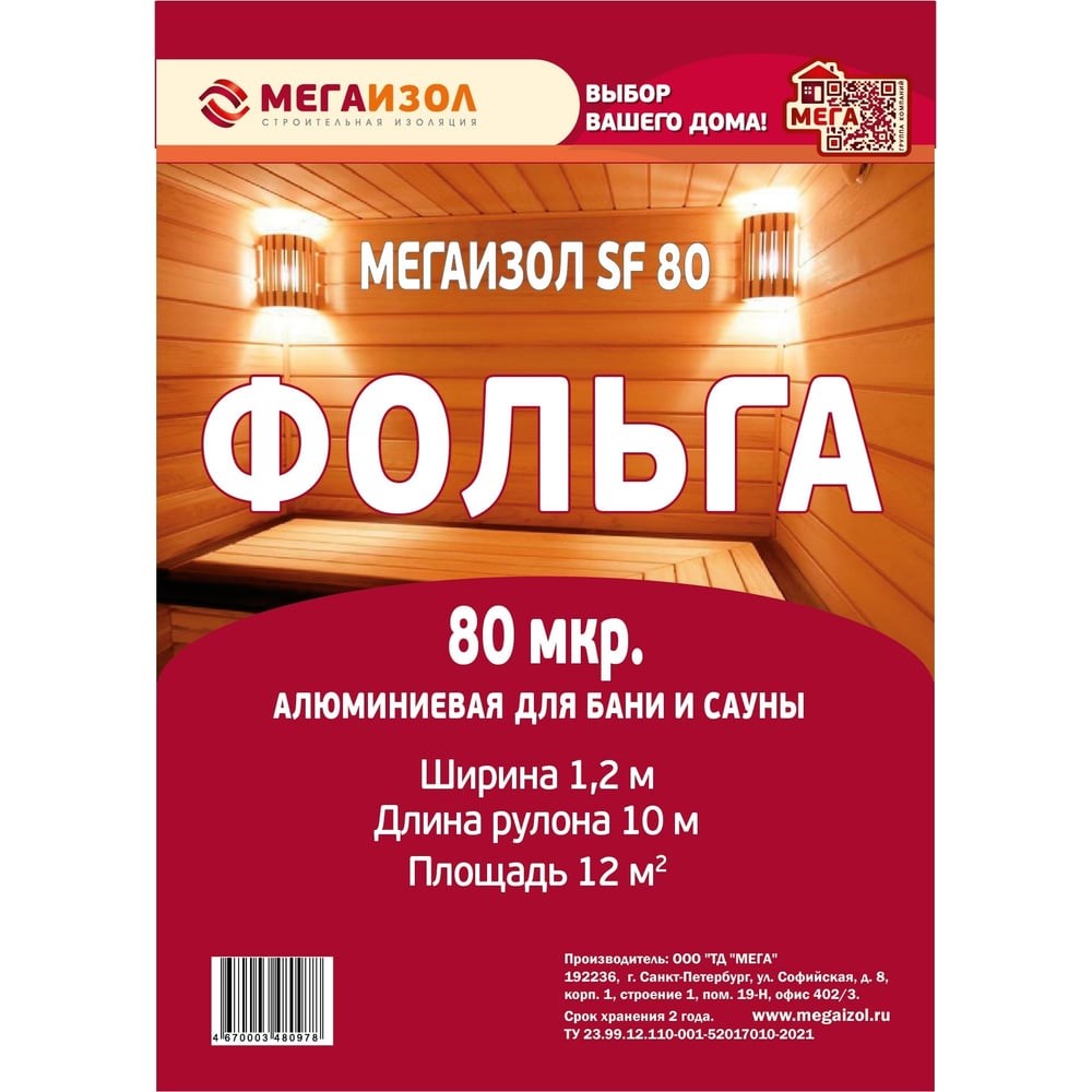 МЕГАИЗОЛ Алюминиевая фольга SF 12 м2 3480978 это алюминиевая фольга толщиной 80 мкр.НазначениеОтражает тепловое излучение. Используется в качестве пароизоляции помещениях с повышенной температурой-банях и саунах; Рассчитан для работы в диапазоне температур -60 °С +150 °С. Не поддерживает горение.Бани и сауны: Способ монтажа: На стены и потолок в парильном помещении фольга расстилается с нахлестом 10-15 см. и закрепляется с помощью монтажного степлера. Для улучшения герметизации рекомендуется проклеить стыки алюминиевым скотчем Мегаизол SK. Сверху, на фольгу, закрепляются рейки сечением 30×50 мм.Они могут быть установлены вертикально или горизонтально, в зависимости от того, как планируется монтировать доски вагонки: в любом случае – перпендикулярно внутренней обшивке. Применение фольги: уменьшает теплопотери через стены и потолок за счет отражающей способности алюминиевой фольги; удерживает пар в парильном помещении; предотвращает образование сырости внутри парильного помещения, возникающее при периодическом изменении температуры и влажности внутри помещения. Трубопроводы: защитный покров тепловой изоляции трубопроводов, расположенных в различных климатических условиях, в том числе в районах Крайнего севера. Утепленные кровля, стены и межэтажные перекрытия : препятствует попаданию пара в утеплитель изнутри помещения; препятствует грибковому заражению и коррозии элементов конструкции; снижает потери тепла за счет отражающей способности алюминиевой фольги.