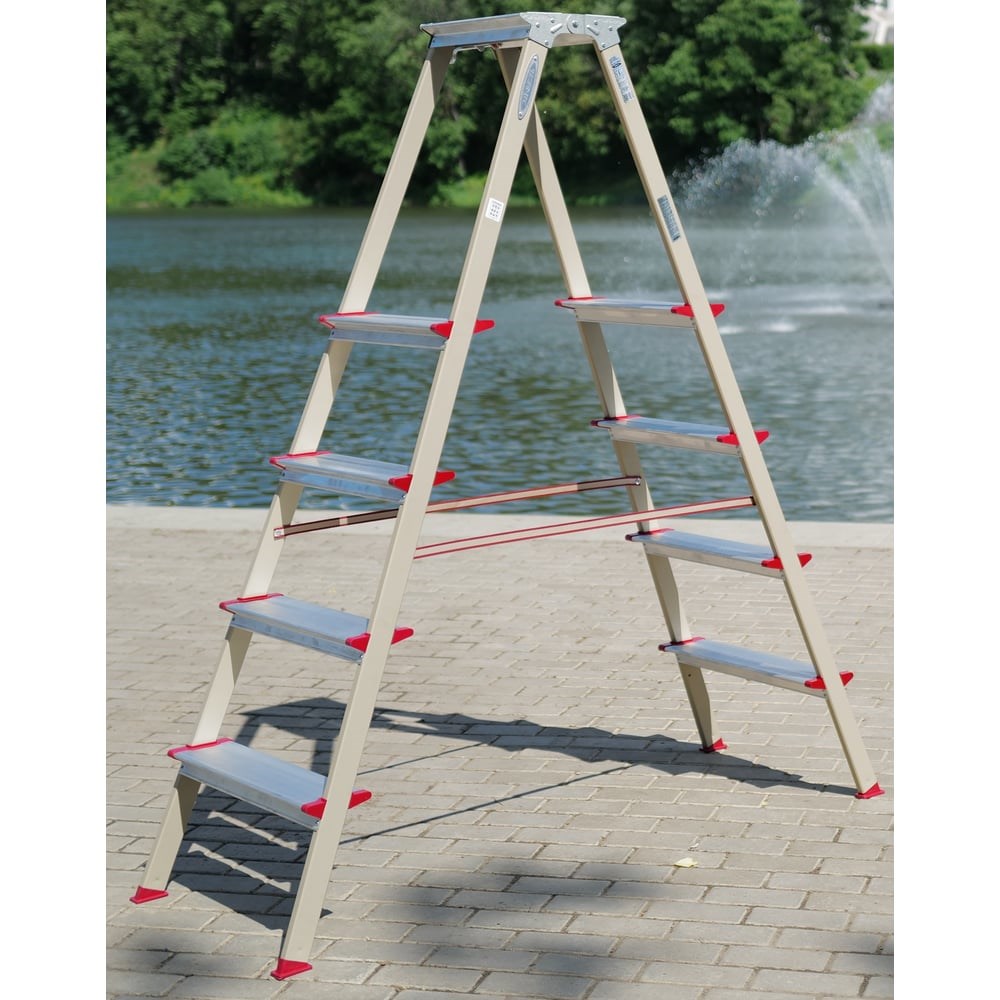 Эргономичный алюминиевый профиль с порошковой окраской - это не только приятные тактильные ощущения, но и никаких острых ребер, а значит никакого дискомфорта для ладоней при захвате и перемещении лестницы. Профиль оптимизирован по весу и нагрузке. Эргономичные ступени обеспечивают стабильную опору и восхождение, а благодаря ширине - 13 см, снижают усталость ног при длительной работе и позволяют трудится в удобной позе. У Парнаса есть удобный крючок, достаточно прочный, чтобы удержать ведро с раствором или смесью на высоте, и функциональная полка шириной 27 см, на которой разместятся необходимые в работе мелочи. А высокие (60 см) поручни позволяют находится на лестнице уверенно и безопасно. Высота подъема ступени рассчитана в соответствии с шириной ступени. Это исключает нахлёст, делая восхождение и спуск максимально легкими и комфортными. Стальная фурнитура и стальной крепеж обеспечивают высокую прочность соединений и устойчивость к коррозии. Опоры выполнены из полимера, устойчивого к истиранию и температурам в диапазоне от -40° до +50°.