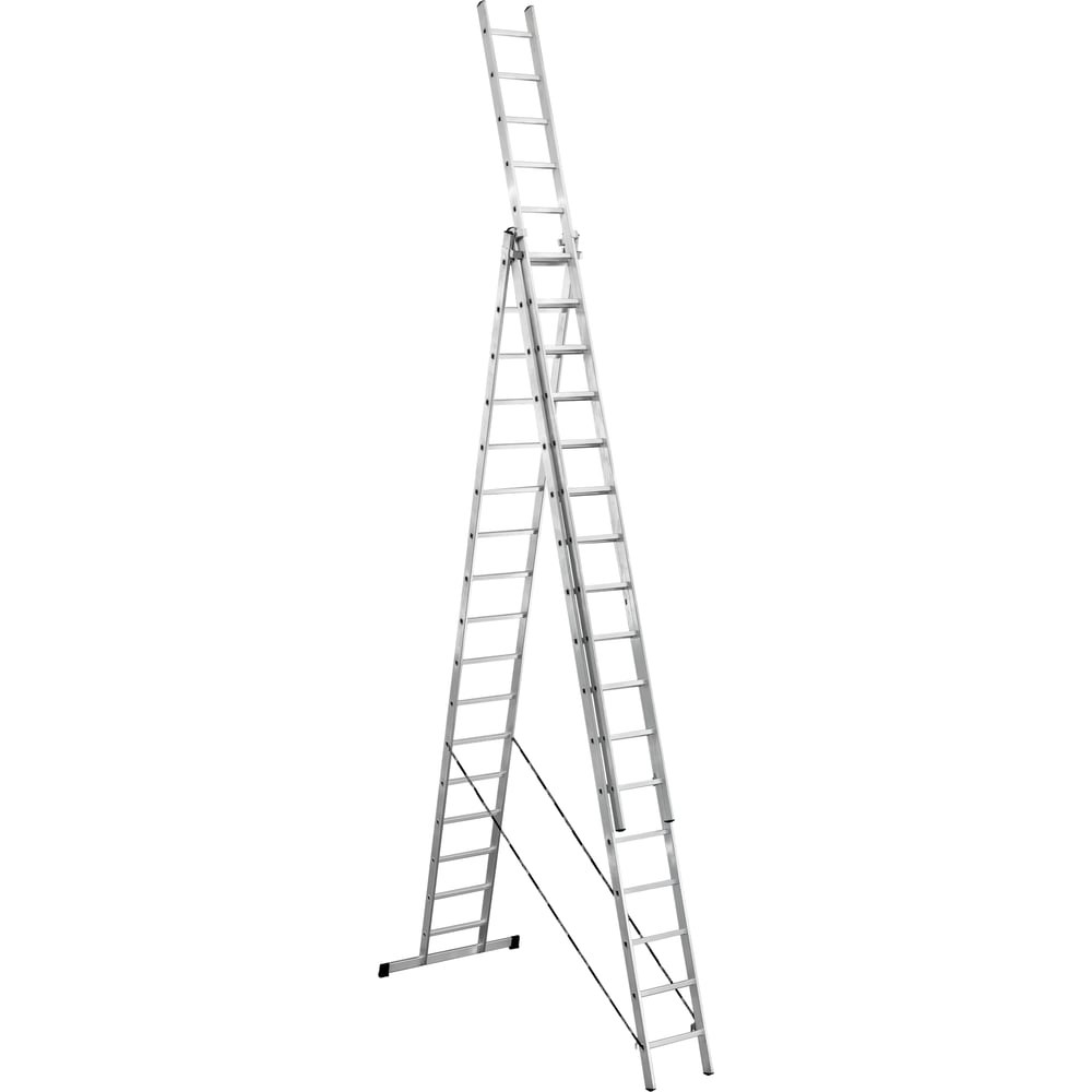 Алюминиевая 3-секционная лестница UFUK 3х17 ступеней 411317 предназначена для выполнения строительных, ремонтных, отделочных или иных видов работ, когда необходимо произвести какие-либо действия на высоте. Конструкция может выглядеть как стремянка, как стремянка с выносной консолью, как приставная лестница с одной, двумя или тремя секциями. Это означает, что область применения модели обширна. В сложенном состоянии лестница занимает мало места. Качественный профиль позволяет ей выдерживать нагрузку до 150 кг. Траверса обеспечивает устойчивость конструкции. Страховочные стяжки исключают самопроизвольное раскладывание приспособления.