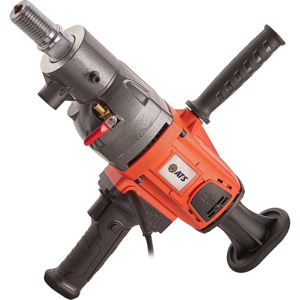 Алмазная дрель AT-S SM-180 оснащена внутренней системой подачи воды. Предназначена для сверления отверстий в бетоне, железобетоне, искусственном и натуральном камне и каменной кладке с использованием алмазных сверлильных коронок с подачей воды. Сухое сверление алмазными дрелями возможно в случаях, когда опасно применять воду. При этом нужно учитывать, что попадание пыли внутрь электромотора значительно увеличивает его износ, так же и алмазные коронки будут быстро изнашиваться. Эффективность технологии алмазного бурения достигается за счет применения чистой водопроводной воды.Дрель можно использовать в любых положениях на 360°, главное защитить электромотор от попадания внутрь воды. Фиксирование вспомогательной ручки на дрели возможно в 4 положениях благодаря съемному кольцу.Основная ручка и вспомогательная ручка прорезинены, удобны и эргономичны. Для удобства сверления в полу вспомогательная ручка переставляется в Т-образное положение.Высокая мощность электропривода и высокий крутящий момент гарантируют эффективность сверления.Кнопка пуска с регулировкой оборотов обеспечивает работу в режиме плавного пуска с пониженным пусковым током. Важно при использовании автономных генераторов. В подборе генератора можно ориентироваться на потребляемую мощность оборудования и при расчете мощности генератора учитывать мин пусковые токи.В дрели предусмотрена механическая муфта для защиты от поломки при заклинивании коронки.Кол-во срабатываний защитной муфты может достигать более 4000 раз.