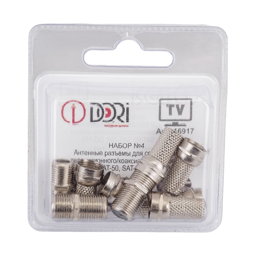 Антенный/телевизионный разъем DORI Набор №4 16917 предназначен для подключения эфирного, спутникового и кабельного телевидения с помощью радиочастотного кабеля. Переходники изготовлены из никелированного сплава первичной меди, что гарантирует минимальный уровень потерь при прохождении сигнала. возможность монтажа без пайки контактов в удаленном месте (на крыше дома); высокая стойкость соединения разъем-кабель к внешним механическим воздействиям. Данный соединитель подходит для кабелей типа RG-6, и других коаксиальных кабелей (SAT-50, SAT-703, DG-113), имеющих наружный диаметр около 6,8 мм.