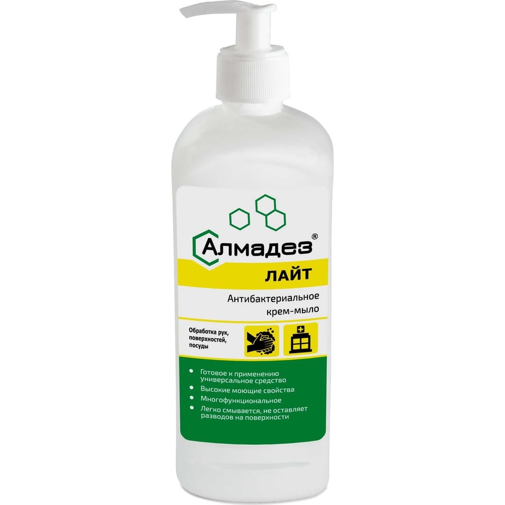 Антибактериальное мыло-крем АЛМАДЕЗ Лайт 500 мл насос-дозатор МАЛ-09 представляет собой гелеобразную жидкость белого цвета с легким запахом применяемой отдушки. Содержит антибактериальную добавку ундециленамидопропиллтримониум метосульфат (Тетранил У), в качестве моющей основы - комплекс ПАВ, в качестве умягчающей и ухаживающей за кожей добавки - глицерин, кокамидопропил бетаин и диэтаноламид кокосового масла. Обладает антимикробной активностью в отношении грамотрицательных и грамположительных бактерий (кроме микобактерий туберкулеза), плесени и грибков. Нежно и бережно очищает кожу рук, не вызывая при этом чувства сухости и стянутости. Применение мыла: Гигиеническая обработка рук: нанести 3-5 мл средства на предварительно увлажнённые руки, обильно вспенить в течении 1 минуты, затем хорошо смыть проточной водой. Санитарная обработка кожных покровов, в том числе ступней ног: нужное количество средства нанести на влажную мочалку и образовавшейся пеной обработать кожные покровы, предотвращая попадание средства в глаза. Затем пену хорошо смыть водой.
