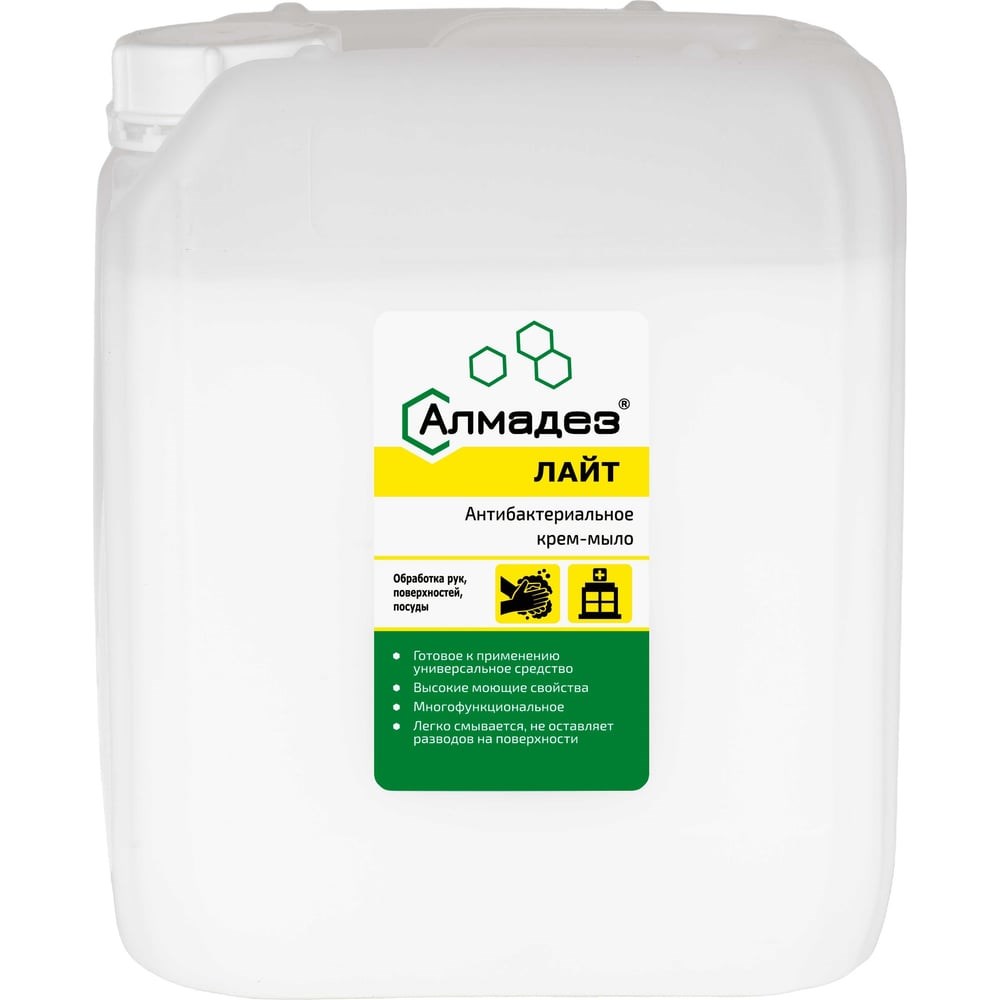 Антибактериальное мыло-крем АЛМАДЕЗ Лайт 5 л евро канистра МАЛ-05 представляет собой гелеобразную жидкость белого цвета с легким запахом применяемой отдушки. Содержит антибактериальную добавку ундециленамидопропиллтримониум метосульфат (Тетранил У), в качестве моющей основы - комплекс ПАВ, в качестве умягчающей и ухаживающей за кожей добавки - глицерин, кокамидопропил бетаин и диэтаноламид кокосового масла. Обладает антимикробной активностью в отношении грамотрицательных и грамположительных бактерий (кроме микобактерий туберкулеза), плесени и грибков. Нежно и бережно очищает кожу рук, не вызывая при этом чувства сухости и стянутости. Применение мыла: Гигиеническая обработка рук: нанести 3-5 мл средства на предварительно увлажнённые руки, обильно вспенить в течении 1 минуты, затем хорошо смыть проточной водой. Санитарная обработка кожных покровов, в том числе ступней ног: нужное количество средства нанести на влажную мочалку и образовавшейся пеной обработать кожные покровы, предотвращая попадание средства в глаза. Затем пену хорошо смыть водой.