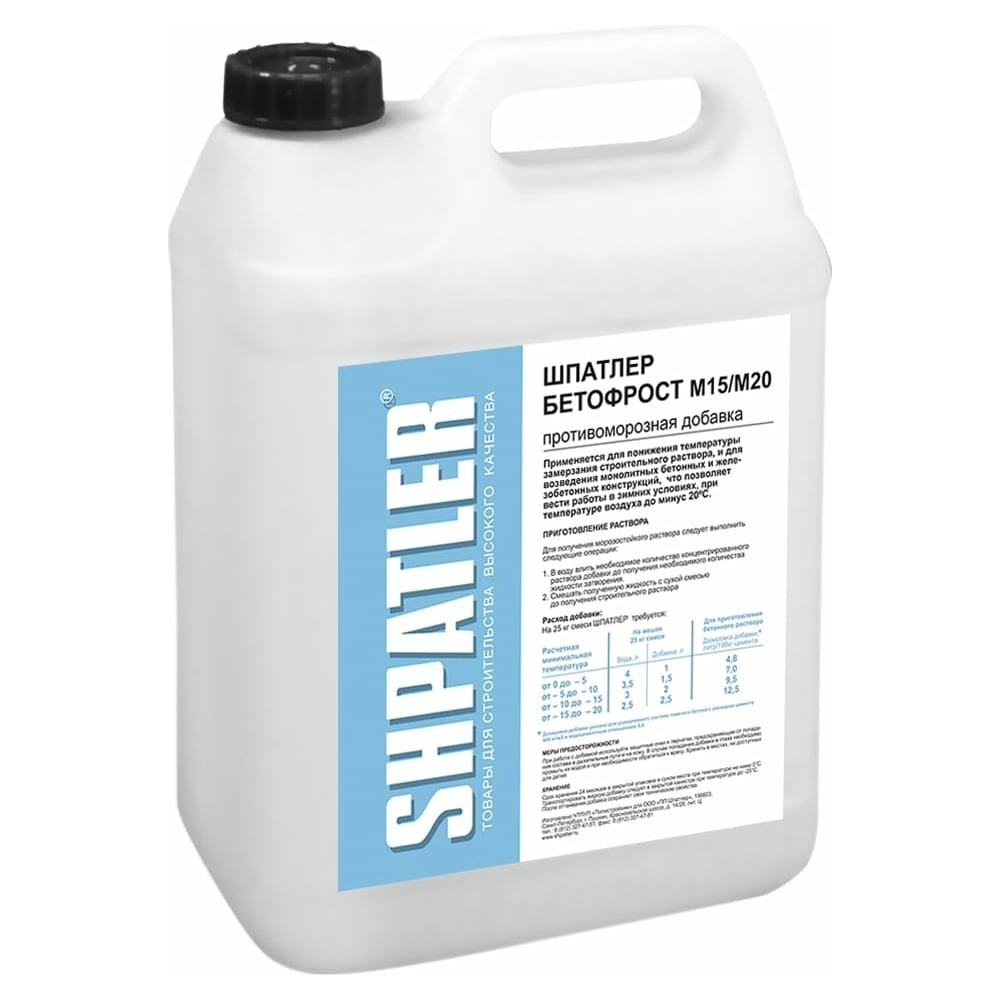 Антифриз - Бетофрост ШПАТЛЕР 10 л M15 / M20 Ш00064 - добавка предназначена для применения при производстве тяжелого бетона при отрицательных температурах наружного воздуха до -15/-20 °С, при возведении монолитных и сборно-монолитных бетонных и железобетонных конструкций, сооружений, изготовлении сборных бетонных и железобетонных изделий в условиях строительных площадок, полигонов. Добавка Бетофрост не снижает сроки жизнеспособности смеси, не изменяет окраску бетона, и не создает выцветов на поверхности бетона. Дозировка добавки зависит от прогнозируемой минимальной температуры окружающего воздуха, состава бетонной смеси, водоцементного отношения. Расчетная минимальная температура Дозировка добавки, % от массы цемента, твердения бетона, °С в расчете на сухое вещество добавки* 0 ÷ -5°С 1,0-2,0% -5 ÷ -10°С 2,0-3,0% -5 ÷ -10°С 3,0-4,0% -10 ÷ -15°С 4,0-5,0% -15 ÷ -20°С 5,0-6,0% * – Дозировка добавки указана для усредненного состава тяжелого бетона с расходом цемента 400кг/м3 и водоцементным отношением 0,4. Добавку транспортируют любым видом транспорта в соответствии с правилами перевозки грузов. Добавку хранят в закрытых помещениях при положительной температуре в герметично закрытой таре. Следует защищать добавку от прямого солнечного света, нагрева свыше 50 °С, и от замерзания. Добавка является не горючей жидкостью. Срок хранения составляет 24 месяцев со дня изготовления.