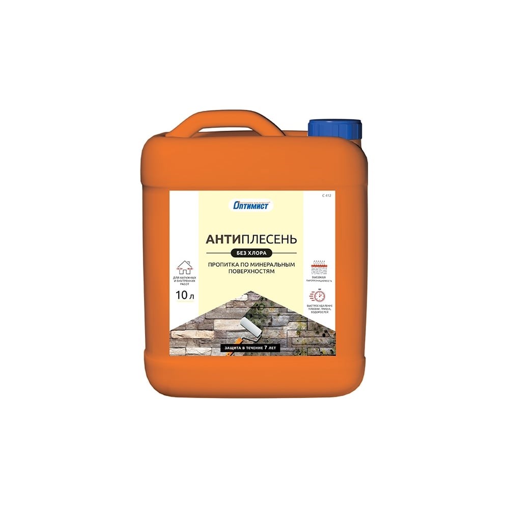 Антиплесень Оптимист C412 без хлора, 10 л 00-00001545 – средство, предназначенное для восстановления минеральных поверхностей, пораженных грибками и водорослями. Не разрушает структуру материала, обладает высокой паропроницаемостью. Средство экологически безопасно, практически не имеет запаха. Антиплесень отличается пожаровзрывобезопасностью, подходит для бытового и промышленного использования.