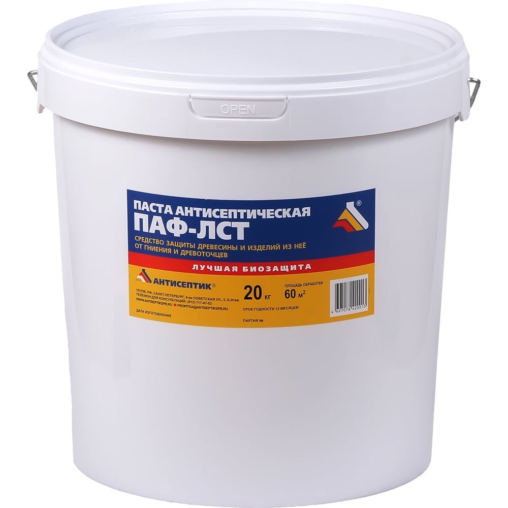 Антисептическая паста в ведре ЗАО "Антисептик" ПАФ-ЛСТ 20 кг 00-00003629 предназначен для защиты древесины от биологического разрушения (гниения, поражения древоточцами) в условиях классов службы I-XII по ГОСТ 20022.2-80. Особенно эффективна для условий возможного развития домовых грибов и обработки сырой древесины. Окрашивает древесину в серо-зеленый цвет и создает шероховатый слой. Не подлежит покраске.