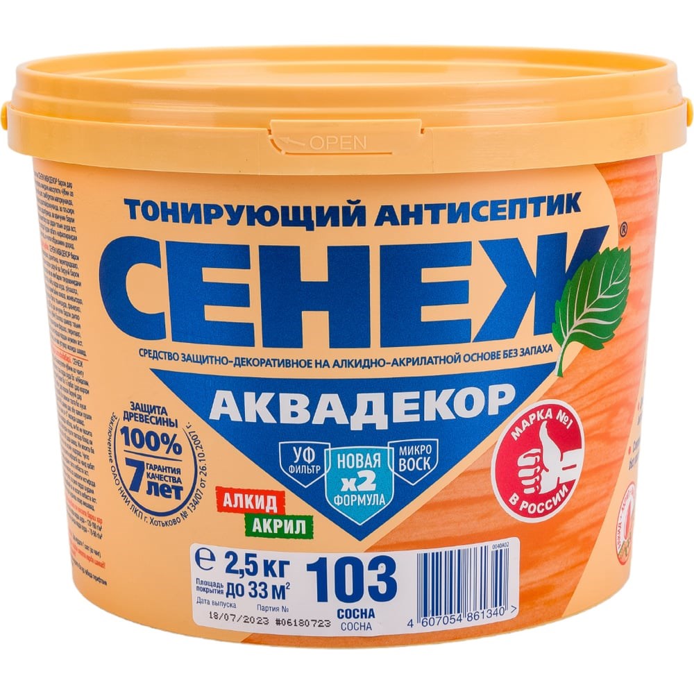 Антисептик для дерева СЕНЕЖ АКВАДЕКОР Х2-103 сосна, 2.5 кг 11041 предназначен для долговременной защиты древесины от атмосферных осадков, плесневых, деревоокрашивающих и дереворазрушающих грибов, водорослей и насекомых-древоточцев, а также декоративной отделки под ценные породы. Готовый к применению водоразбавляемый состав на алкидно-акрилатной основе с добавлением льняного масла отлично проникает в древесину, формирует эластичное дышащее защитное покрытие с мягким шелковистым блеском. Материал используют для наружных и внутренних работ (окрашивание стен, обшивок, перегородок, фронтонов, дверей, оград, садовой мебели, фанеры, шпона, ДСП и ДВП, а также других пиленых, строганных, рубленых деревянных поверхностей). Допускается обработка антисептиком полов, перил, террас с последующим покрытием устойчивым к истиранию лаком. Способ применения: Продукт перед использованием тщательно перемешать и наносить на очищенную от грязи, пыли, старых покрытий древесину кистью, валиком, губкой, безвоздушным распылением в 1-2 слоя (внутренние работы) или 2-3 слоя (наружные работы, влажные или солнечные условия) вдоль волокон с промежуточной сушкой 45-60 минут в сухую облачную погоду при температуре воздуха не ниже +5 градусов. Особо тщательно обрабатывать торцы. Не обрабатывать мерзлую древесину. Время высыхания 1 час (от пыли). Расход для однослойного нанесения для пиленой поверхности 120 - 180 г/кв. м, для строганной поверхности 70 - 90 г/кв. м. Внимание! Окончательный цвет формируется при высыхании.