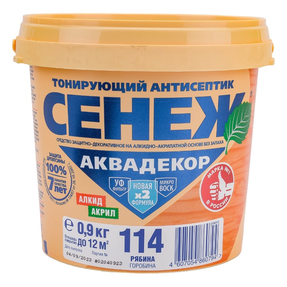 Антисептик для дерева СЕНЕЖ АКВАДЕКОР Х2-114 рябина, 0.9 кг 11072 предназначен для долговременной защиты древесины от атмосферных осадков, плесневых, деревоокрашивающих и дереворазрушающих грибов, водорослей и насекомых-древоточцев, а также декоративной отделки под ценные породы. Готовый к применению водоразбавляемый состав на алкидно-акрилатной основе с добавлением льняного масла отлично проникает в древесину, формирует эластичное дышащее защитное покрытие с мягким шелковистым блеском. Материал используют для наружных и внутренних работ (окрашивание стен, обшивок, перегородок, фронтонов, дверей, оград, садовой мебели, фанеры, шпона, ДСП и ДВП, а также других пиленых, строганных, рубленых деревянных поверхностей). Допускается обработка антисептиком полов, перил, террас с последующим покрытием устойчивым к истиранию лаком. Способ применения: Продукт перед использованием тщательно перемешать и наносить на очищенную от грязи, пыли, старых покрытий древесину кистью, валиком, губкой, безвоздушным распылением в 1-2 слоя (внутренние работы) или 2-3 слоя (наружные работы, влажные или солнечные условия) вдоль волокон с промежуточной сушкой 45-60 минут в сухую облачную погоду при температуре воздуха не ниже +5 градусов. Особо тщательно обрабатывать торцы. Не обрабатывать мерзлую древесину. Время высыхания 1 час (от пыли). Расход для однослойного нанесения для пиленой поверхности 120 - 180 г/кв. м, для строганной поверхности 70 - 90 г/кв. м. Внимание! Окончательный цвет формируется при высыхании.