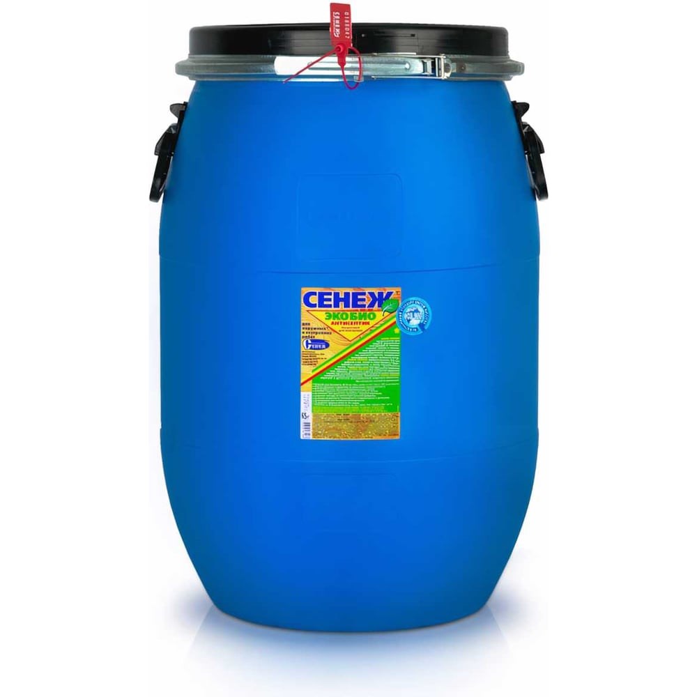 Антисептик для дерева СЕНЕЖ ЭКОБИО бочка Е 65 кг 00000000631 предназначен для защиты древесины от гниения, плесени, синевы и насекомых-древоточцев внутри помещений и на открытом воздухе (под навесом) в условиях гигроскопического и конденсационного увлажнения без контакта с грунтом, воздействия атмосферных осадков, почвенной влаги самостоятельно или в качестве биозащитной грунтовки под ЛКМ. Допускается применять состав для защиты элементов наружной службы, подверженных атмосферным осадкам, при последующем покрытии влагостойким лакокрасочным материалом. Область применения. Используют для пропитки новых и ранее обработанных антисептиком деревянных стен, полов, перегородок, обрешеток, мансард, чердачных конструкций внутри зданий и сооружений, а также других пиленых, строганных, рубленых элементов конструкций жилищного, общественного, производственного и сельскохозяйственного назначения внутренней службы. Внимание! Не применяют по поверхностям, ранее покрытым олифой, краской, лаком, другими пленкообразующими или водоотталкивающими материалами. Расход: При нанесении кистью, валиком, распылителем не менее 250 - 300 г/кв. м. При вымачивании или автоклавировании 60 - 80 кг/куб. м.