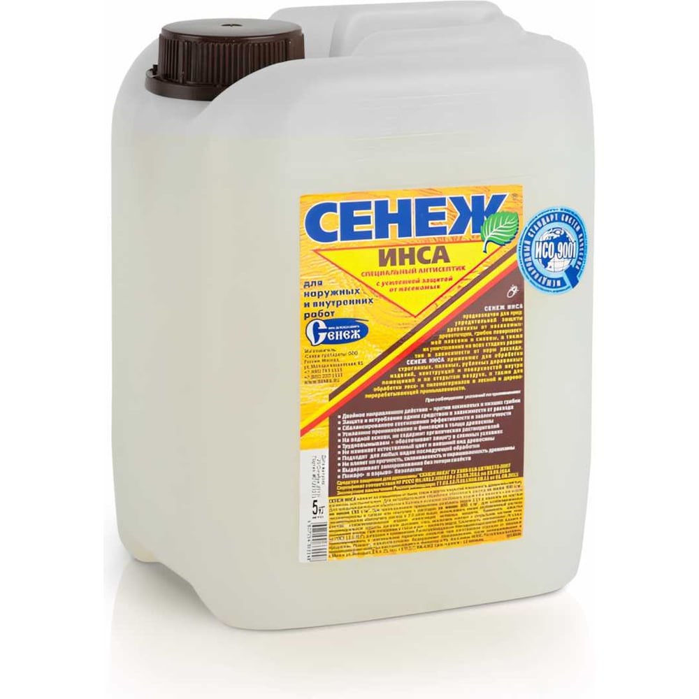 Антисептик для дерева СЕНЕЖ ИНСА канистра, 5 кг 00000004413 предназначен для защиты древесины от некоторых грибов поверхностной плесени и синевы, а также предупредительной и истребительной защиты от насекомых-древоточцев на всех стадиях их развития в условиях гигроскопического и конденсационного увлажнения, периодического воздействия атмосферных осадков, без контакта с грунтом. Область использования: Продукт применяют для обработки строганных, пиленых, рубленых деревянных изделий, конструкций и поверхностей внутри помещений и на открытом воздухе на объектах жилищного, общественного, производственного и сельскохозяйственного назначения, а также для обработки лесо- и пиломатериалов экспортного и местного назначения при атмосферной сушке, накоплении, хранении и перевозке всеми видами транспорта, включая морской, в лесной и деревоперерабатывающей промышленности. Расход зависит от степени поражения древесины и составляет не менее 300 г/кв. м для истребительной обработки, не менее 15 г/кв. м для предупредительной.