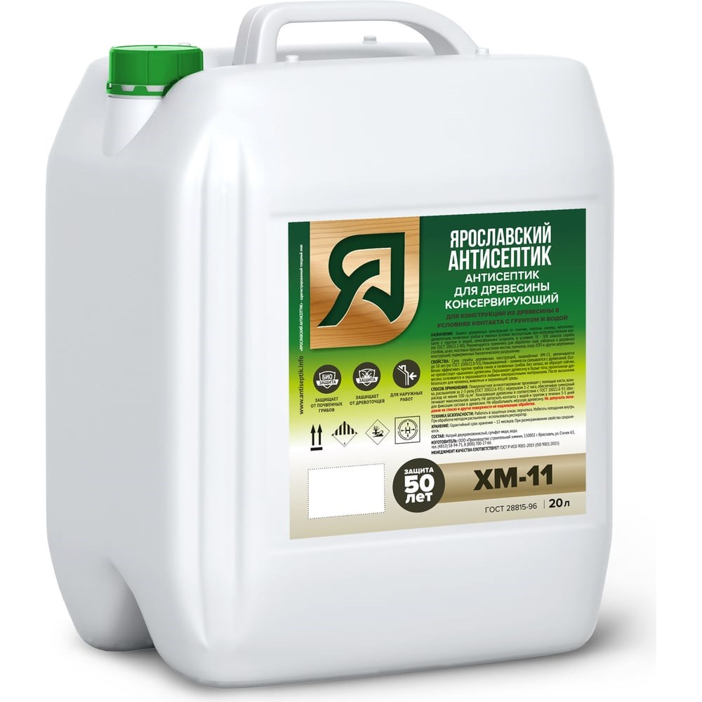 Антисептик ХМ-11 под торговой маркой «Ярославский антисептик» производится по ГОСТ 28815-96 «Растворы водные защитных средств для древесины» и предназначен для биологической защиты древесины от грибов (гниения, плесени, синевы) и насекомых-древоточцев при постоянном прямом контакте дерева с водой и грунтом. ХМ-11 особенно эффективен против почвенных грибов. Объекты защиты: мосты, причалы и пирсы, дорожные и заборные столбы, шпалы, опоры линий электропередач и связи, сваи, основания теплиц и другие деревянные сооружения и элементы, полностью или частично утопленные в грунт и воду.