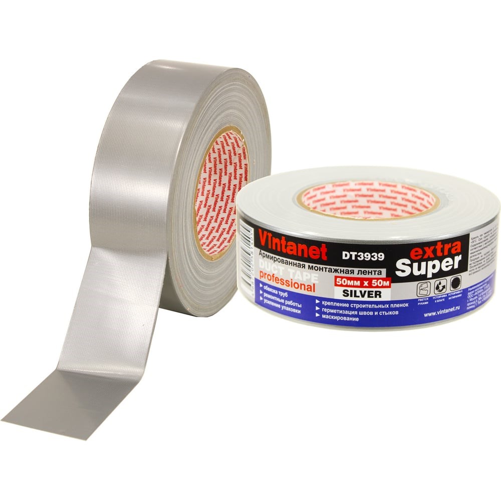Монтажная армированная лента Vintanet DT3939 ЭКСТРА СУПЕР, серебряная, 50 мм х 50 м DT39395050S - тканевая лента с полиэтиленовым покрытием. Клеевое покрытие - синтетический каучук. Устойчива к истиранию и к влаге. Легко рвется руками. Применяется в ремонтных работах, для обвязки труб, крепления ковров, герметизации швов и стыков воздуховодов систем кондиционирования, маскирования, крепления строительных пленок, крепления упаковки.