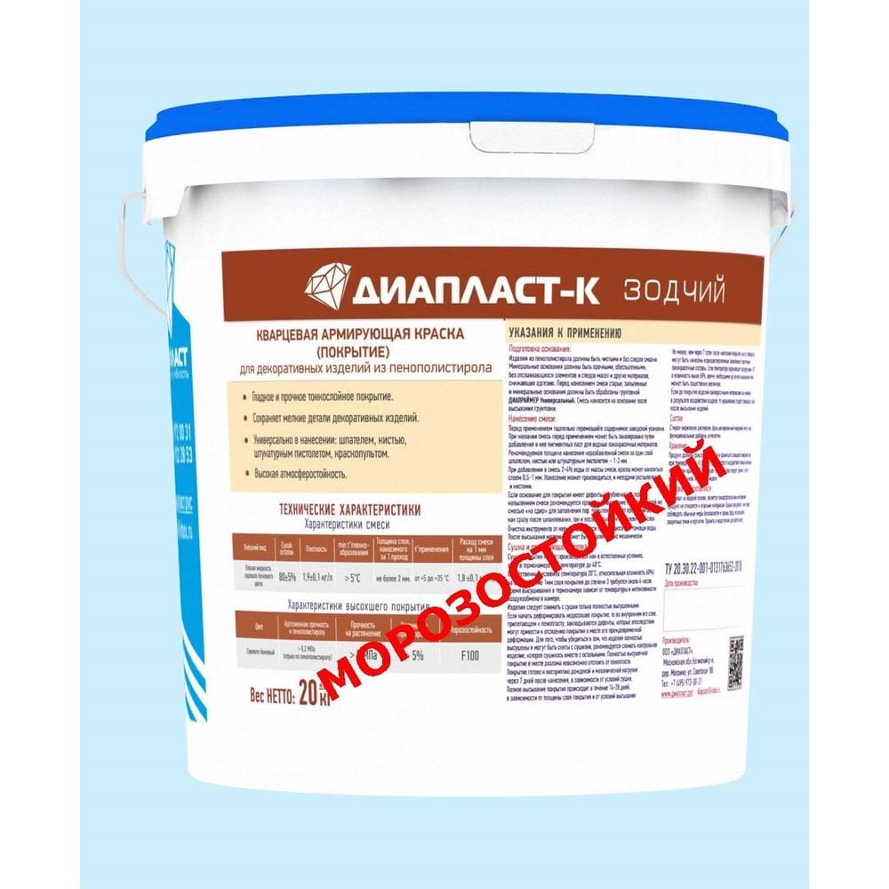 ДИАПЛАСТ – К Зодчий представляет собой готовую к употреблению смесь на основе сополимерной стиролакриловой дисперсии, тонкодисперсного кварцевого наполнителя и комплекса модифицирующих добавок. Состав предназначен для нанесения на декоративные изделия из пенополистирола и других материалов с целью создания на их поверхности твердого и прочного слоя для защиты от механических повреждений и от воздействия окружающей среды. Покрытие может применяться как внутри помещений, так и снаружи. Смесь может наноситься на обрабатываемую поверхность различными методами: В неразбавленной форме — шпателем, кистью или при помощи картушного распылителя (хоппер-гана). В этом случае слой, наносимый за один проход, может достигать толщины 1-2 мм. Поверхность при распылении в этом случае получается с легкой шагренью. Шпателем же или кельмой можно получать на отделываемой поверхности различные текстурные эффекты. При добавлении 2-4% воды краска может наноситься и картушным распылителем, и обычными краскопультами, и при помощи красконагнетательных баков. Рекомендуемый диаметр сопла краскопульта – не менее 2 мм. При напылении разбавленной смеси получается практически гладкая поверхность. При нанесении разбавленной смеси при помощи кисти, полосы от нанесения так же частично сглаживаются и выравниваются на поверхности. Морозостойкий состав позволяет транспортировку без соблюдения температурного режима.