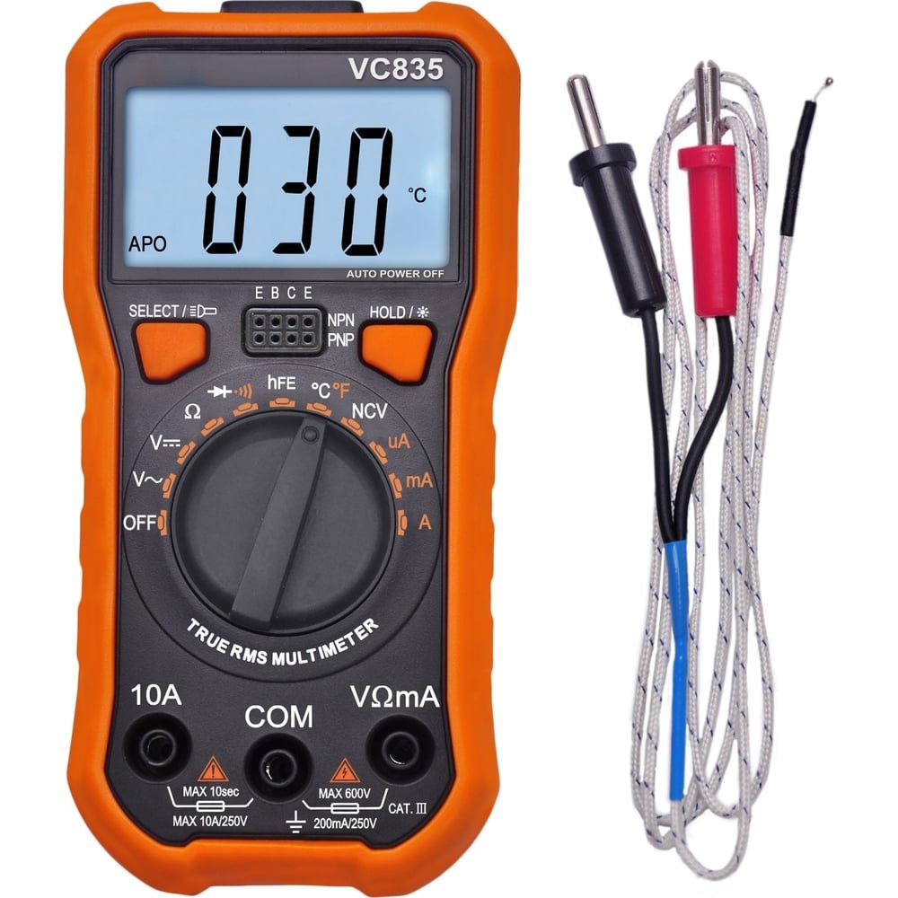 Автоматический цифровой мультиметр Вымпел VC835 5228 используется для измерения постоянного и переменного напряжения, силы тока, сопротивления, температуры и коэффициента усиления транзистора. В модель также включены функции проверки диодов и непрерывности электрической цепи. Для облегчения считывания информации все необходимые показатели выводятся на дисплей с подсветкой. Возможность фиксации данных облегчает работу в труднодоступных местах.