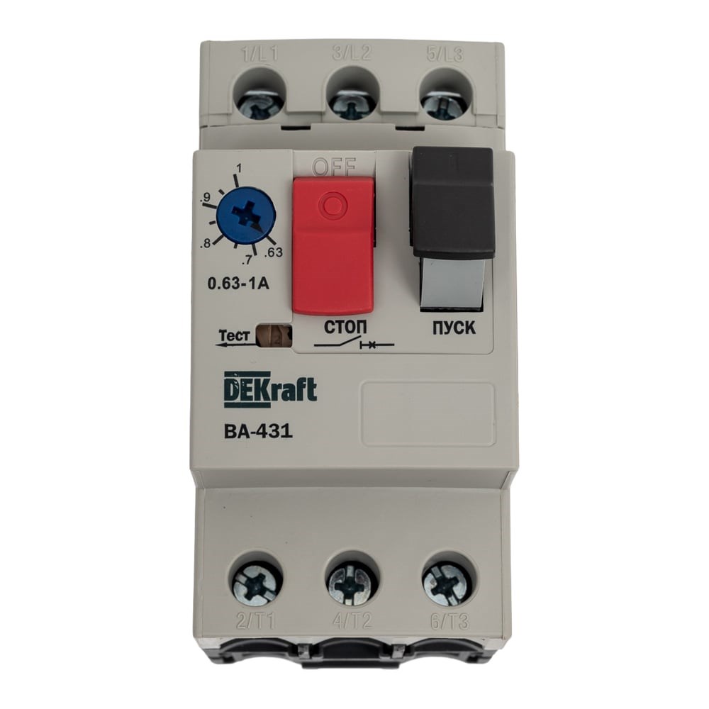Автоматический выключатель серии ВА-431 Dekraftдиапазон уставок тока 0,63 - 1,0 Аном. раб. напряжение 690 Всечение подключаемых проводников 1,0 - 6,0 кв. ммКорпус устройства изготовлен из самозатухающей пластмассы. Автоматические выключатели защиты двигателя серии ВА-431 Dekraft предназначены для управления и защиты трехфазных асинхронных электродвигателей от короткого замыкания, перегрузки и выпадения фазы. Дополнительно доступен ряд аксессуаров, облегчающих работу с устройством.