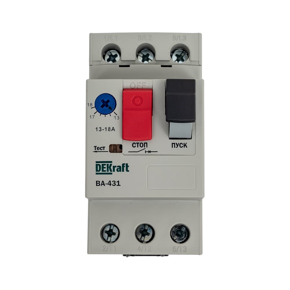 Автоматический выключатель серии ВА-431 Dekraftдиапазон уставок тока 13,0 - 18,0 Аном. раб. напряжение 690 Всечение подключаемых проводников 1,0 - 6,0 кв. ммКорпус устройства изготовлен из самозатухающей пластмассы. Автоматические выключатели защиты двигателя серии ВА-431 Dekraft предназначены для управления и защиты трехфазных асинхронных электродвигателей от короткого замыкания, перегрузки и выпадения фазы. Дополнительно доступен ряд аксессуаров, облегчающих работу с устройством.