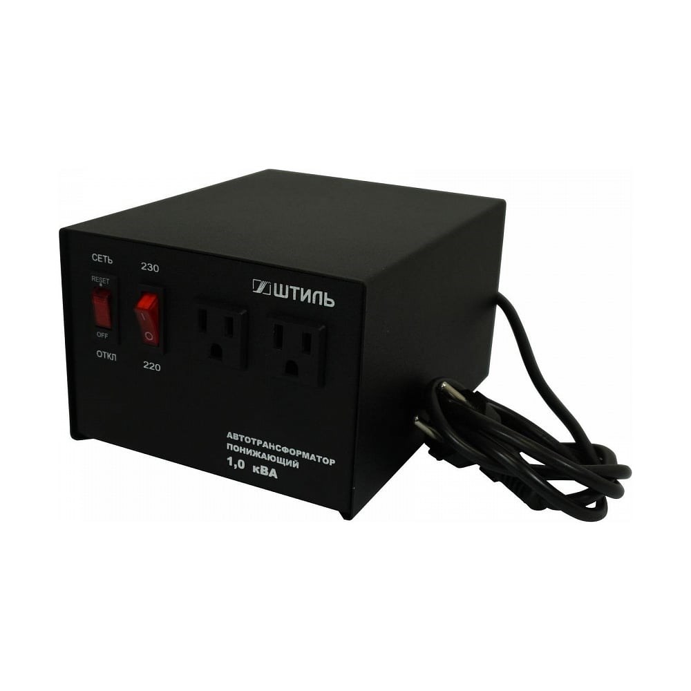 Автотрансформатор Штиль 1,0 кВА, в черном корпусе АТ 230-220/СТО-1,0-50 ч/к предназначен для электропитания приборов, аппаратуры и устройств переменным током напряжением 100 В от стандартной электросети с напряжением 220 В или 230 В. Автотрансформатор может использоваться для электропитания японской аппаратуры, рассчитанной на электропитающую сеть 50/60 Гц 100 В. Изделие представляет собой понижающий однофазный преобразователь напряжения, состоящий из следующих основных частей: металлический корпус, понижающий автотрансформатор на тороидальном сердечнике, автоматический выключатель "СЕТЬ", переключатель "220-230 В", позволяющий выбрать напряжение сети, две розетки американского стандарта для подключения нагрузки на 100 Вольт, сетевой шнур с евровилкой.