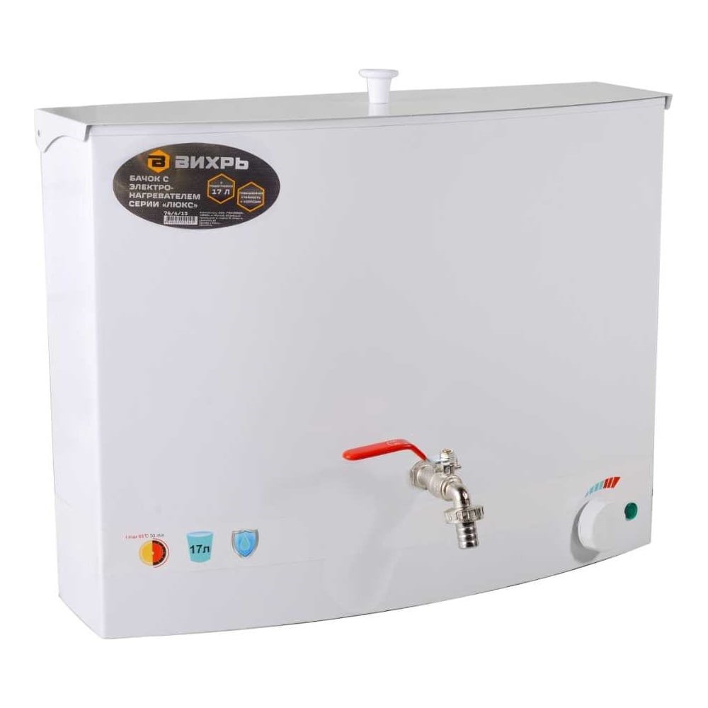 Бачок с электронагревателем Вихрь — отличное решение для дач и частных домов, в которых отсутствует горячее водоснабжение. Устройство имеет компактные размеры, поэтому монтаж проводится быстро и легко. Для простой фиксации предусмотрены два кронштейна. Вес устройства всего 4,5 кг, не создает большую нагрузку, прост в транспортировке. Объем бачка равен 17 л — достаточное количество подогретой воды позволяет обеспечить комфорт при отсутствии горячего водоснабжения.Бачок комплектуется электрическим нагревательным элементом мощностью 1300 Вт. Благодаря ему, нагрев занимает 40 минут времени. Подогретая вода может использоваться для мытья посуды, рук и прочих гигиенических процедур, других целей. Бачок с электронагревателем Вихрь окрашен в белый цвет, поэтому отличается универсальностью. Комплектуется металлическим краном. Благодаря нанесенному слою краски, обеспечивается надежная защита от коррозии и длительный срок эксплуатации.