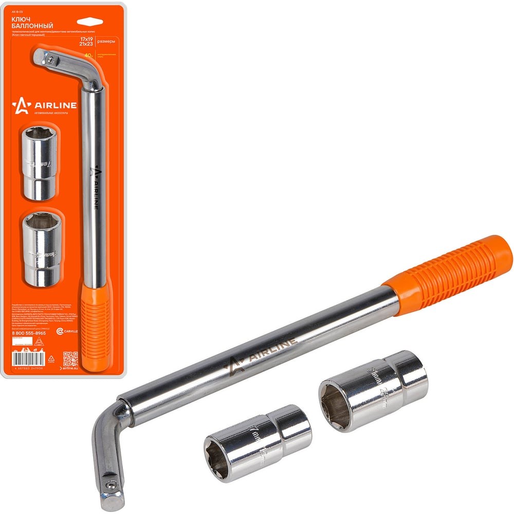 Балонный телескопический ключ 17х19х21х23 Airline AK-B-03 представляет собой устройство с двумя сменными головками, которое предназначено для установки и снятия колес автомобиля. Изогнутая конструкция обеспечивает удобство работы с труднодоступными крепежными элементами. Твердость стали - 40 Х. Качественное приспособление соответствует ГОСТ.