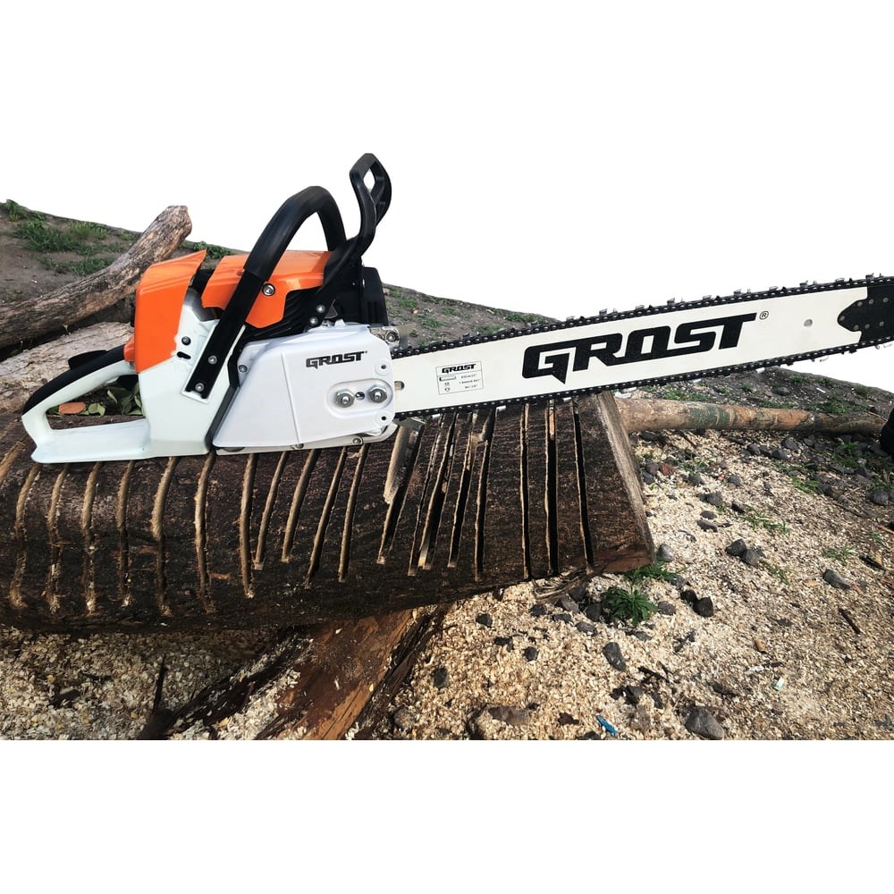 Бензомоторная цепная пила Grost - это мощный инструмент предназначенный для профессиональных и любительских работ. Поставляется в комплекте с шиной длиной 18 дюймов. Прекрасно работает с шинами до 25 дюймов. Оснащена зубчатым упором, за счет чего безопасна при эксплуатации.