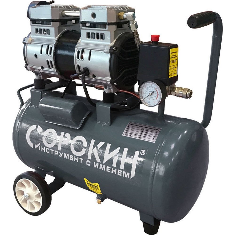 Воздушный безмасляный компрессор 24л Сорокин 13.2 оборудован безмасляной головкой, что обеспечивает получение чистого сжатого воздуха без примесей масла. Компактный компрессор легко перемещается за счет небольших габаритов и веса. Для облегчения транспортировки внутри и снаружи помещений снабжён колёсами и дополнительной ручкой на корпусе. Имеет низкий уровень шума при высокой производительности. Оборудование также обеспечивает подачу воздуха без включения двигателя за счет использования запасов в ресивере.