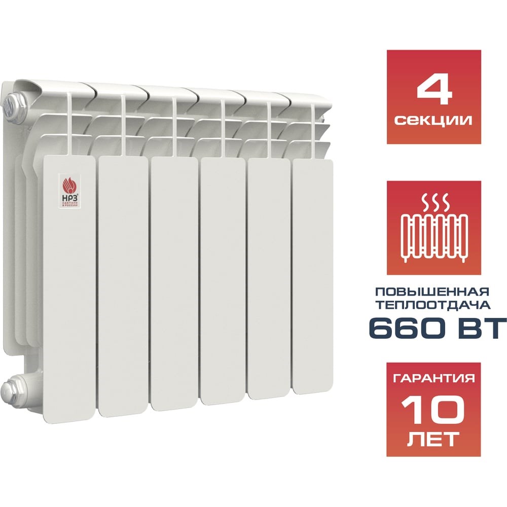 Биметаллический радиатор НРЗ содержит стальной закладной элемент - вертикальный коллектор и горизонтальные, которые формируются вместе с корпусом из алюминиевого сплава в процессе литья под давлением. Рекомендован к установке в квартире. При сниженном потреблении тепловой энергии (теплоносителя) обеспечивает быстрый прогрев воздуха.Малая иннерционность биметаллического радиатора НРЗ обеспечивает эффективное терморегулирование максимального уровня комфорта пользователя.Главное преимущество радиатора НРЗ – полностью замкнутый цикл производства и подтверждение заявленного уровня теплоотдачи реальными испытаниями в аккредитованных лабораториях.Радиатор выполнен из высокопрочного алюминиевого сплава АК12М2 (100% российского сырья) по ГОСТ 1583-93 на автоматизированных комплексах “BUHLER” (Швейцария) и YIZUMI (Китай). Высокое содержание кремния (12%) в сплаве обеспечивает лучшие прочностные характеристики. За счет полноценных боковых рёбер радиатор обеспечивает более эффективную конвекцию.Механическая обработка и сборка радиатора НРЗ производится на автоматизированных линиях «Gi-Zeta» (Италия) и “SAIP” (Италия). Соединение секций осуществляется с помощью ниппелей и каучуковыми прокладками Kevlar, с двойным графитовым покрытием, которые исключают возможность деформации.Технология покраски с использованием линии анафорезной и порошковой окраски «Ideal-Line” (Дания) включает химическое обезжиривание и пассивацию, антикоррозийную обработку.