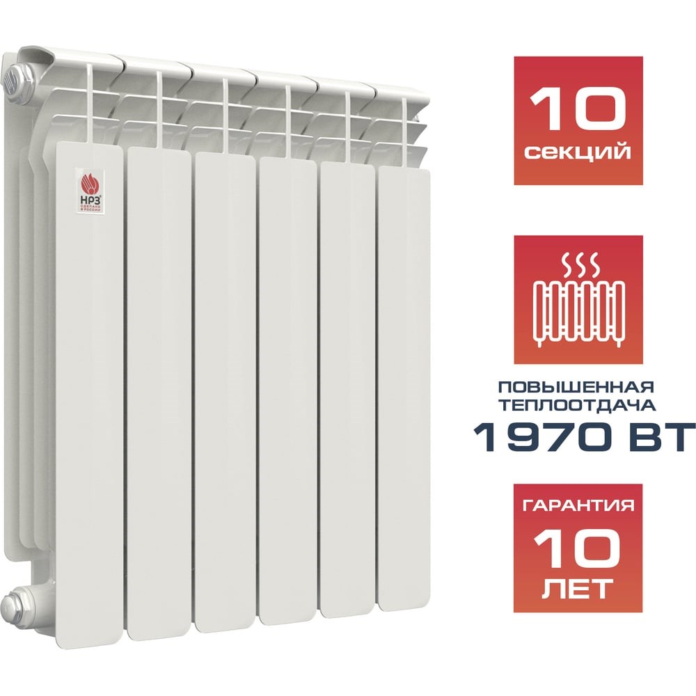 Биметаллические радиаторы «НРЗ» содержат стальной закладной элемент - вертикальный трубопровод и 2 горизонтальных трубопровода, которые формируются вместе с корпусом из алюминиевого сплава в процессе литья под давлением. Рекомендованы к установке в квартире. Главное отличие радиаторов НРЗ – полностью замкнутый цикл производства и подтверждение заявленного уровня теплоотдачи реальными испытаниями в аккредитованных лабораториях. Радиаторы «НРЗ» выполнены из высокопрочного алюминиевого сплава АК12М2 (100% российского сырья) по ГОСТ 1583-93 на автоматизированных комплексах “BUHLER” (Швейцария) и YIZUMI (Китай). Высокое содержание кремния (12%) в сплаве обеспечивает лучшие прочностные характеристики. За счет полноценных боковых рёбер радиаторы «НРЗ» обеспечивают более эффективную конвекцию. Механическая обработка и сборка радиаторов НРЗ производится на автоматизированных линиях «Gi-Zeta» (Италия) и “SAIP” (Италия). Соединение секций осуществляется с помощью ниппелей. В качестве межсекционных уплотнителей используются кольцевые прокладки, армированные кевларовым волокном, которые исключают возможность деформации. Технология покраски с использованием линии анафорезной и порошковой окраски «Ideal-Line” (Дания) включает химическое обезжиривание и пассивацию, антикоррозийную обработку.