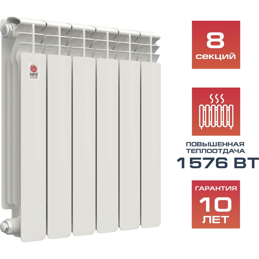 Биметаллические радиаторы «НРЗ» содержат стальной закладной элемент - вертикальный трубопровод и 2 горизонтальных трубопровода, которые формируются вместе с корпусом из алюминиевого сплава в процессе литья под давлением. Рекомендованы к установке в квартире. Главное отличие радиаторов НРЗ – полностью замкнутый цикл производства и подтверждение заявленного уровня теплоотдачи реальными испытаниями в аккредитованных лабораториях. Радиаторы «НРЗ» выполнены из высокопрочного алюминиевого сплава АК12М2 (100% российского сырья) по ГОСТ 1583-93 на автоматизированных комплексах “BUHLER” (Швейцария) и YIZUMI (Китай). Высокое содержание кремния (12%) в сплаве обеспечивает лучшие прочностные характеристики. За счет полноценных боковых рёбер радиаторы «НРЗ» обеспечивают более эффективную конвекцию. Механическая обработка и сборка радиаторов НРЗ производится на автоматизированных линиях «Gi-Zeta» (Италия) и “SAIP” (Италия). Соединение секций осуществляется с помощью ниппелей. В качестве межсекционных уплотнителей используются кольцевые прокладки, армированные кевларовым волокном. Технология покраски с использованием автоматизированной линии анафорезной и порошковой окраски «Ideal-Line” (Дания) включает химическое обезжиривание и пассивацию, антикоррозийную обработку. Каждый радиатор дважды проходит гидравлическое испытание под давлением в 1.5 раза превышающим максимальное рабочее.