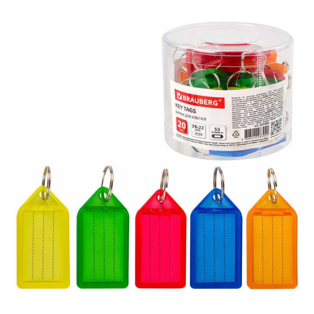 Бирки BRAUBERG для ключей комплект 20 шт, длина 55 мм, инфо-окно 39х22 мм, ассорти 237495 предназначены для идентификации ключей от разных помещений. Вкладыши для маркировки имеют прозрачную вставку, благодаря чему защищены от повреждений. За счет наличия металлических колец прослужат долгое время. Бирки не подвержены деформации, поэтому отличаются практичностью.