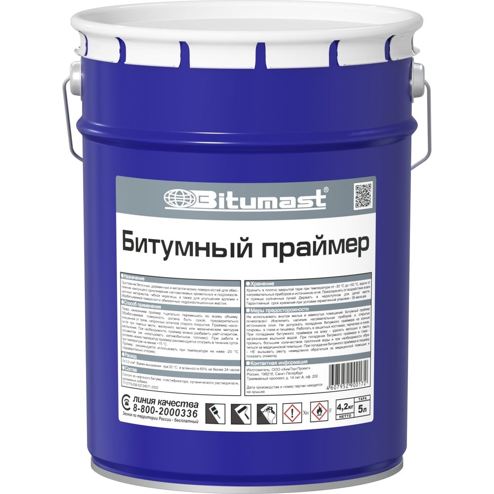 Битумный праймер, 5 л Bitumast 4607952900172 обеспечивает высокую адгезию гидроизоляционных и кровельных материалов с поверхностью. Используется для грунтования поверхности перед нанесением битумных герметиков, обмазочных гидроизоляционных мастик, а также кровельных материалов в рулонах. Состав: нефтяной битум, органический растворитель и пластификатор. Применение: допускается разведение мастики уайт-спиритом или сольвентом. Тщательно перемешать вещество, затем валиком нанести на чистую и сухую поверхность. Средство использовать при температуре не ниже минус 5 градусов.