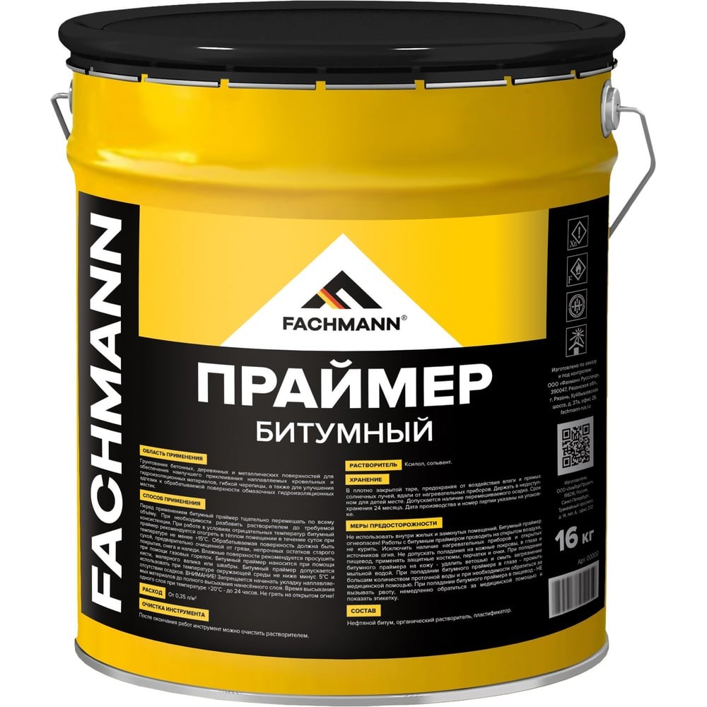 Битумный праймер FACHMANN служит для подготовки поверхности к укладке наплавляемых и самоклеящихся кровельных и гидроизоляционных материалов. Обработка битумным праймером повышает сцепление основания с покрытиями. Применяется для грунтования бетонных, деревянных и металлических поверхностей.Состав праймера Фахманн проникает в поры и технологические трещины, склеивает, герметизирует и повышает стойкость к влаге. В результате процесс финишной отделки ускоряется, а покрытия и основание становятся более долговечными. Праймер отличается хорошей укрывистостью: его расход при покрытии в один слой составляет от 300 г/м².Битумный праймер может наноситься на плоские кровельные покрытия, плиты перекрытия, бетонные конструкции: фундаменты, цоколь и прочие элементы здания, касающиеся почвы. Предназначен для наружных работ.