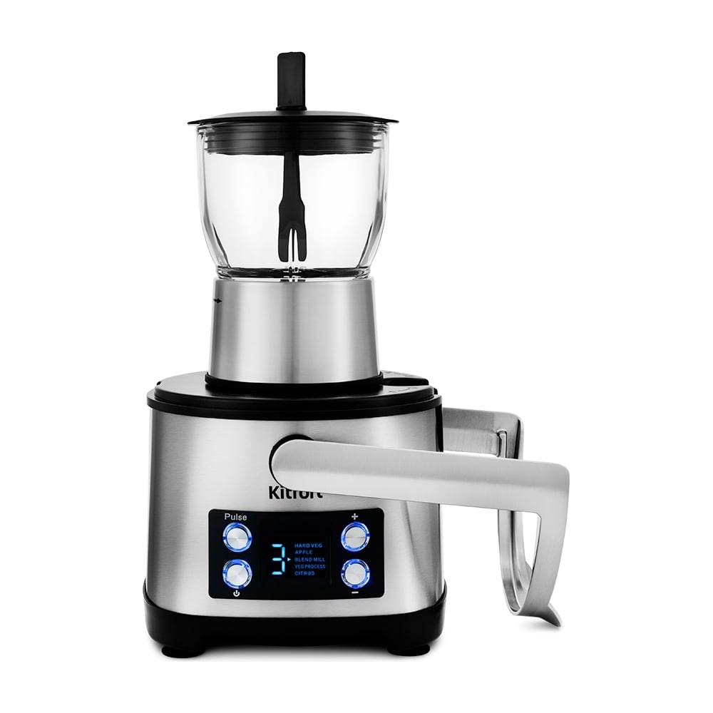 Кухонный процессор KITFORT 11 в 1 КТ-1395 сочетает в себе функции 11 устройств: тёрка, шинковка, соломорезка, блендер и кофемолка, центробежная соковыжималка и соковыжималка для цитрусовых, измельчитель для мяса, насадка для жидкого теста, насадка в виде ножа и мутовка. Блендер подходит для приготовления фруктовых и фитнес-напитков, смузи, протеиновых смесей, молочных коктейлей, супов-пюре, соусов и детского питания. При помощи кофемолки можно перемалывать и измельчать кофейные зёрна, зёрна перца, специи и т.п. Чаша ёмкостью 1,5 л и чаша кофемолки ёмкостью 0,2 л выполнены из стекла. В крышке чаши блендера есть отверстие для добавления ингредиентов непосредственно во время работы. Колпачок отверстия может использоваться как мерный стакан. Данная конфигурация измельчит мясо и мясные продукты, а также имбирь, чеснок, замороженные ягоды и кофе. Ингредиенты можно добавлять прямо во время работы через отверстие в крышке чаши. В комплекте идёт пластиковая лопатка. Блендер, кофемолка и измельчитель для мяса оснащены 4-лезвийными блоками ножей из нержавеющей стали с оптимальной формой лезвий и заточки под каждую функцию.